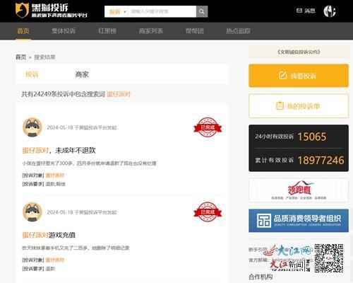 然而,记者2024年5月27日通过黑猫投诉平台查询到涉及“蛋仔派对”字样的投诉高达24249条,且数量仍在实时增长,其中未成年充值占比最高。