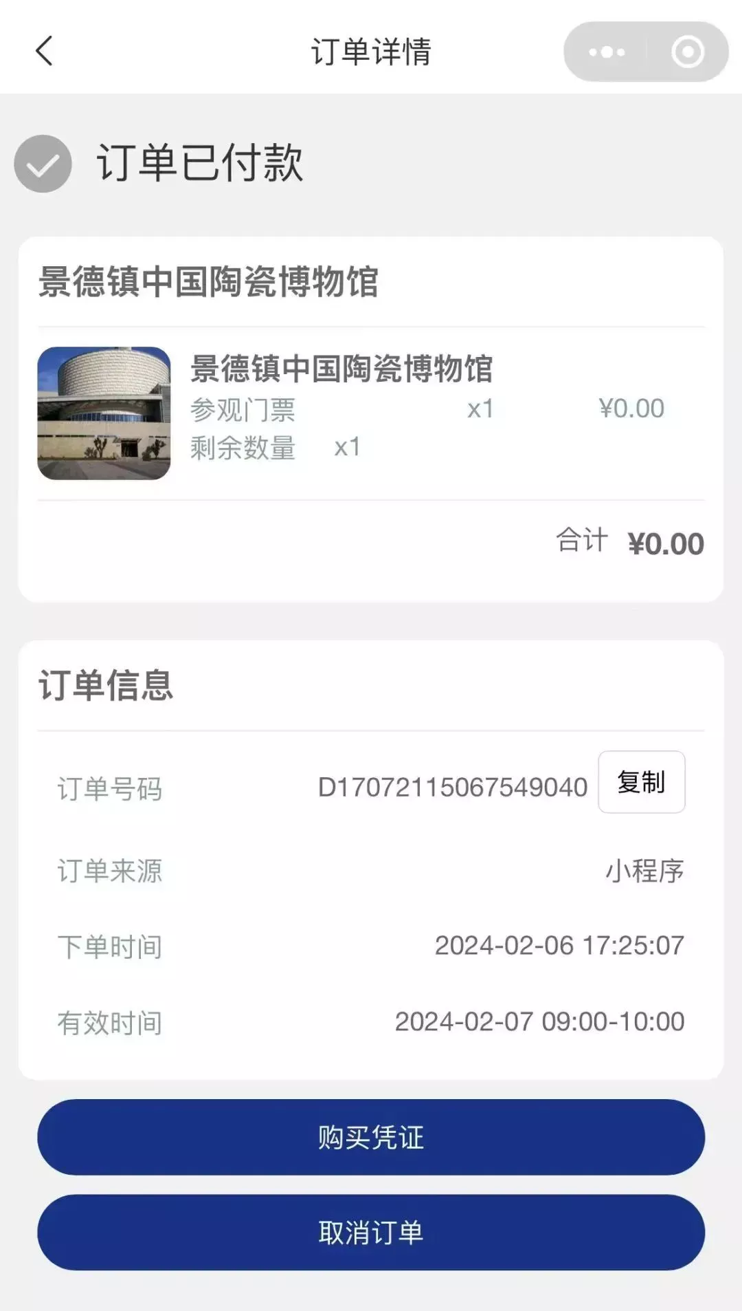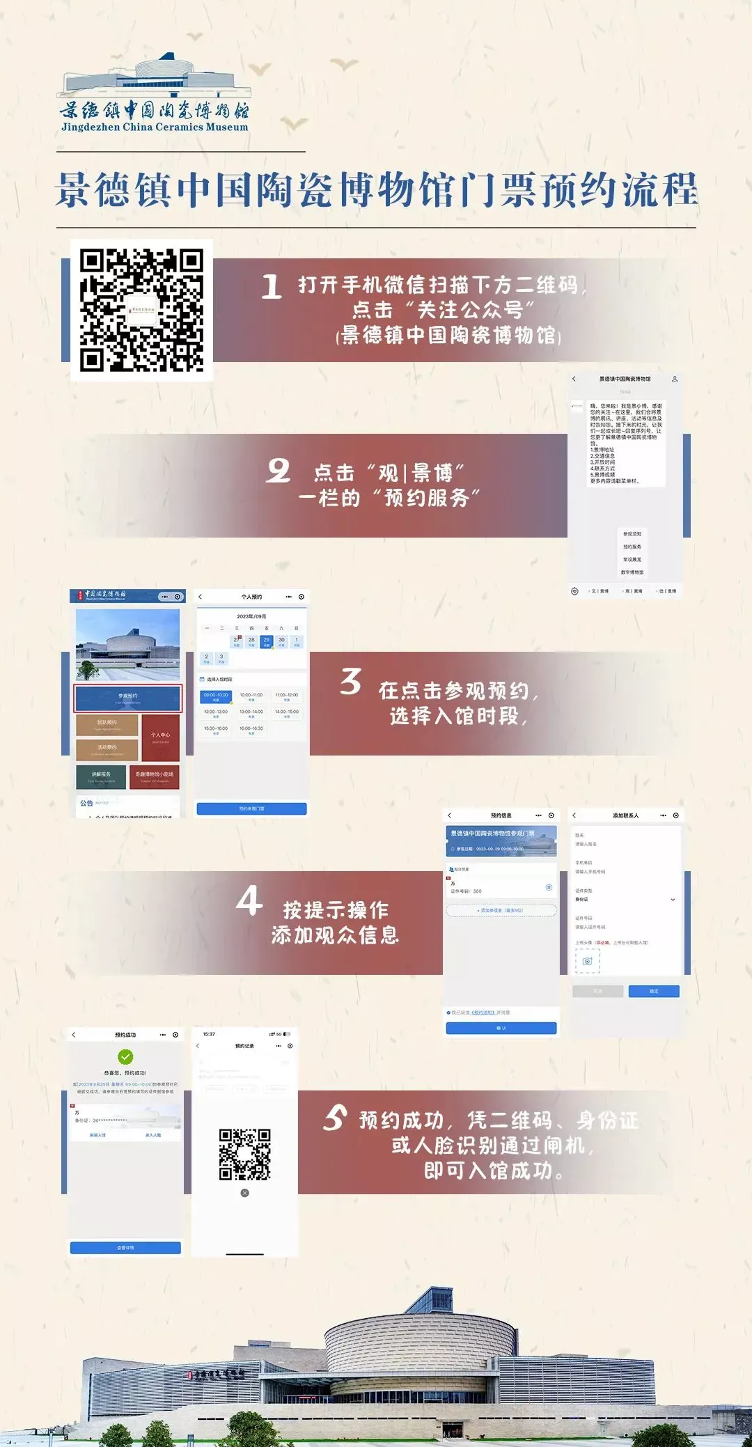 该馆门票以预约方式免费提供,请各位观众通过“景德镇中国陶瓷博物馆”官方微信公众号或“畅游景德镇”小程序正规渠道预约。收费预约均非该馆所为,该馆未授权或委托任何第三方平台的组织、机构或个人提供代预约门票服务。请各位观众谨慎识别,以免上当受骗,避免时间、经济损失。
