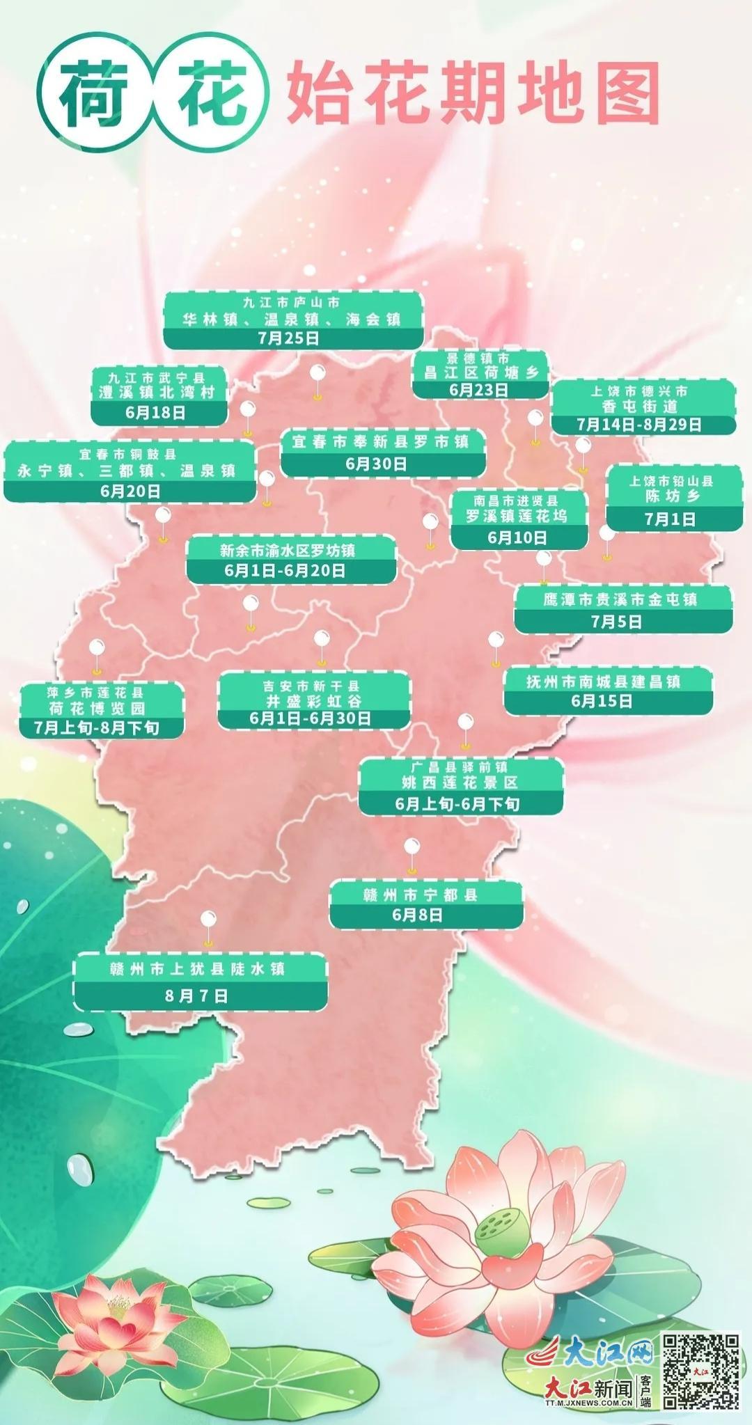江南都市报讯 皮婉婷、全媒体记者章娜、实习生秦昕报道:端午粽飘香,赏荷正当时。荷花,又名莲花、水芙蓉,是中国的十大名花之一,在民间有“六月花神”的称号。5月29日,省气象局发布江西各地荷花始发期“地图”,包括全省11个设区市的16处荷花集中种植地。该“地图”显示,从6月至8月上旬,我省各地种植的荷花将陆续开花,并依次迎来最佳赏花期。