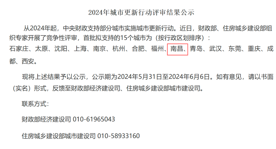 5月31日,财政部、住房和城乡建设部公示城市更新行动入围城市名单, 南昌市进入公示名单,成功入选后,最高将获中央财政补助10亿元。