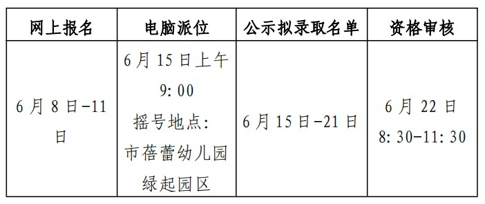 (三)电脑派位产生的拟录取幼儿,须在规定的时间内参加录取资格审核,办理入园手续(体检、注册等)。凡逾期未参加录取资格审核或未按时办理入园手续的,将取消招生录取资格,其责任由幼儿监护人承担。