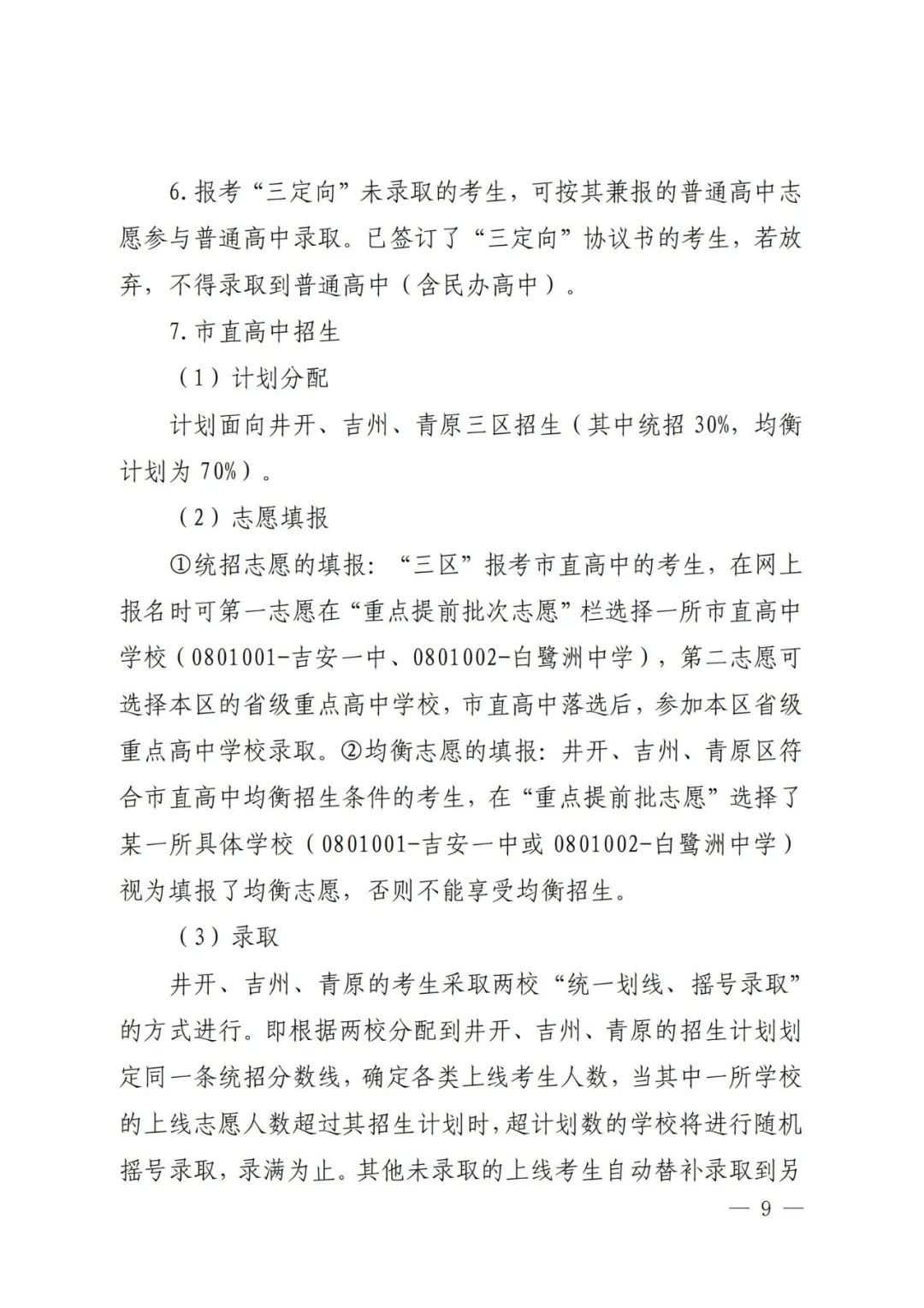 1.所有公民办普通高中全面实行属地招生,采取网上填报志愿,按志愿择优录取。城区普通高中(含市属高中)在所在城区或若干城区内招生,县域普通高中在本县域内招生。市属普通高中具体招生方案由市教育体育局制定,各县(区)具体招生方案由各县(区)自行制定,报市教育体育局备案。