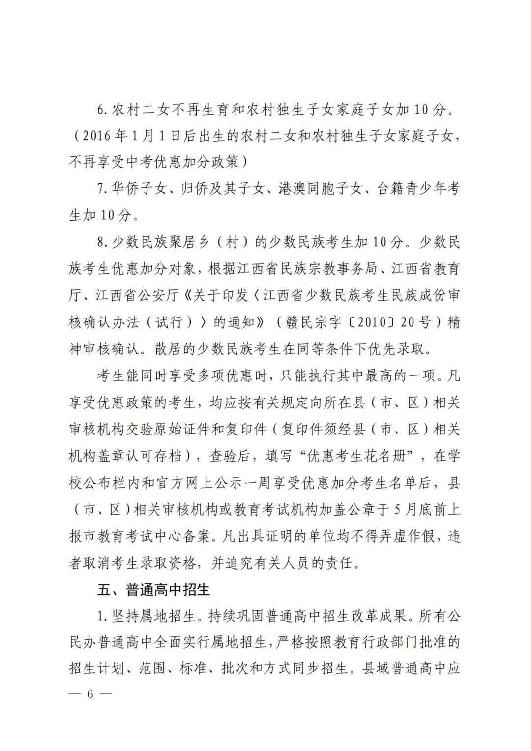 6.农村二女不再生育和农村独生子女家庭子女加10分(2016年1月1日以后出生的农村二女和农村独生子女家庭子女,不再享受中考优惠加分政策)。