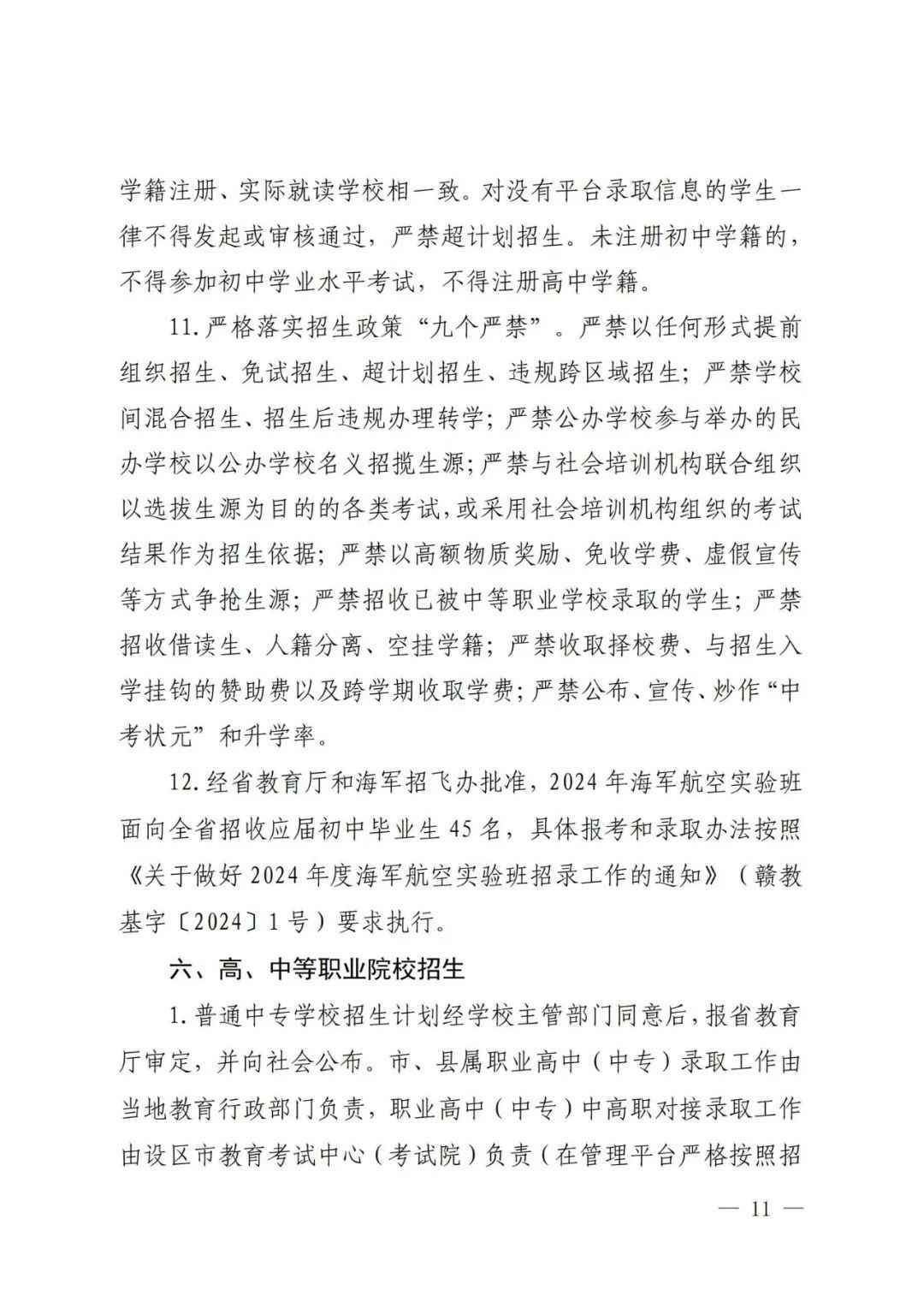 (4)南昌二中海军航空实验班招生录取。经省教育厅和海军招飞办批准,南昌二中面向全省招收应届初中毕业生45名组建海军航空实验班,具体报考和录取办法按照《关于做好2024年度江西省海军航空实验班招录工作的通知》(赣教基字〔2024〕1号)执行。