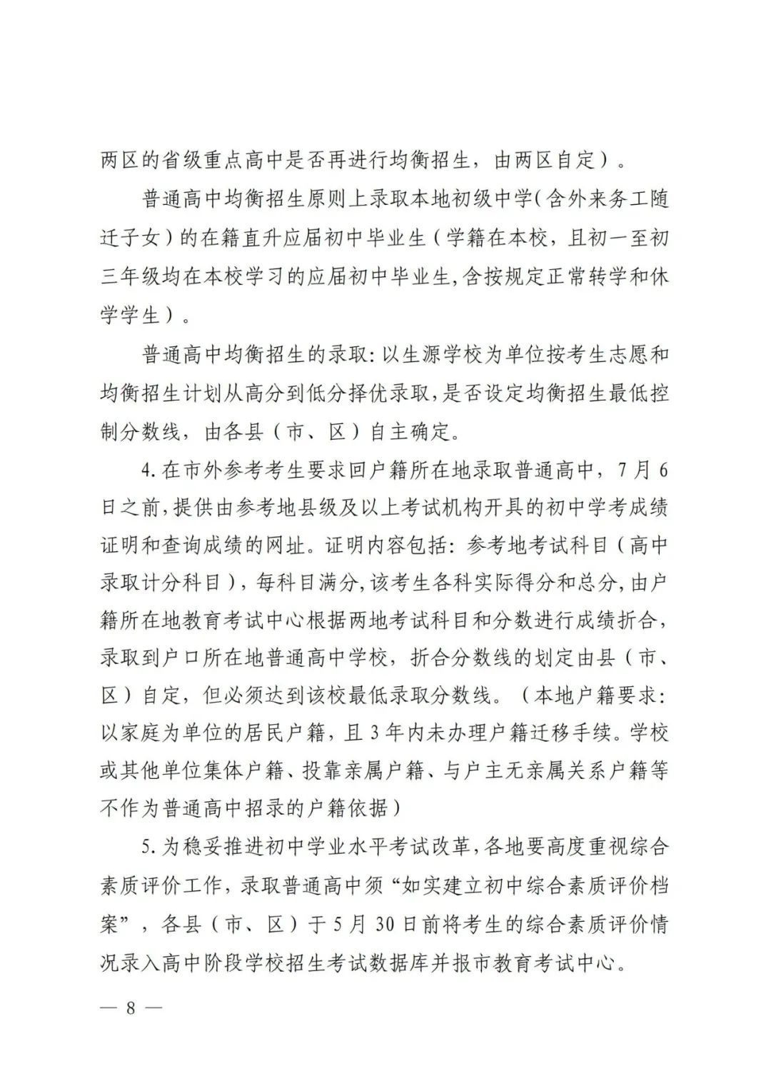 7.对在省外以及跨设区市、跨县(区)参加高中阶段学校考试,回户籍所在地录取的随迁子女,须经考生学籍所在地教育行政部门审核同意的前提下,考生考试成绩经折算后达到当地录取学校统招录取分数线的方可录取。(本地户籍要求:以家庭为单位的居民户籍,且3年内未办理户籍迁移手续。学校或其他单位集体户籍、投靠亲属户籍、与户主无亲属关系户籍等不作为普通高中招录的户籍依据)