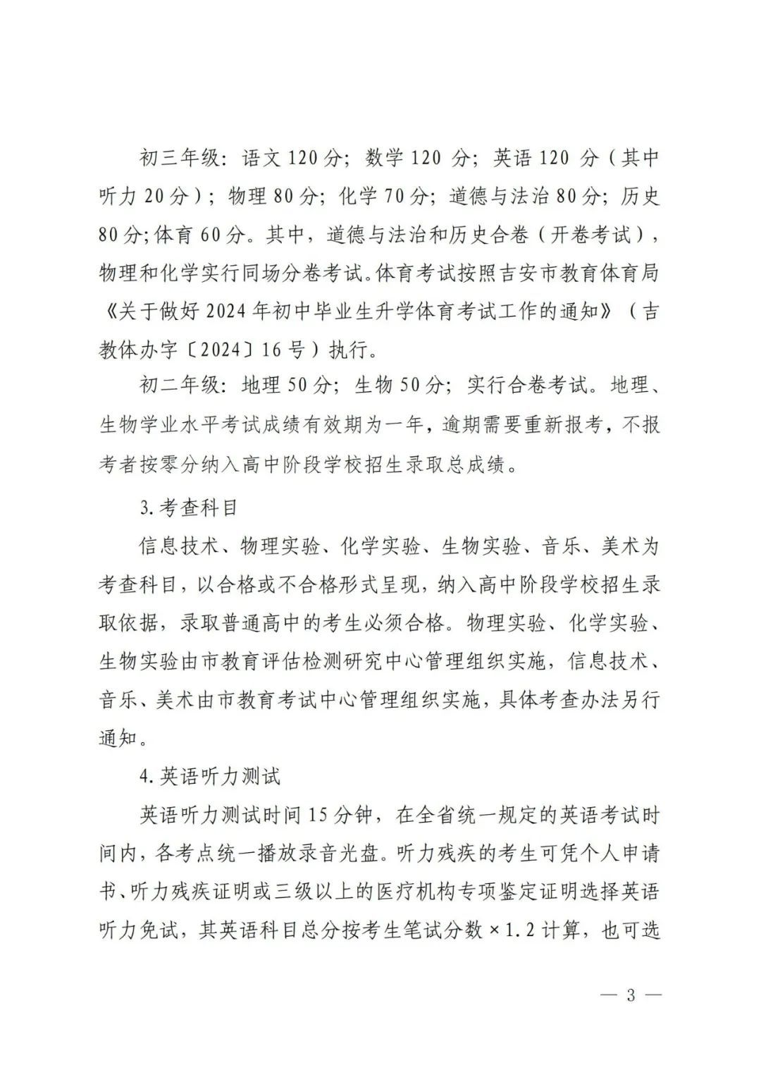 物理、化学实验操作考查要求:按《关于印发<2024年抚州市初中学业水平考试实验操作科目考查评分标准>的通知》(抚教体教考字〔2024〕3号)文件执行,考查时间原则上与体育考试时间同步。