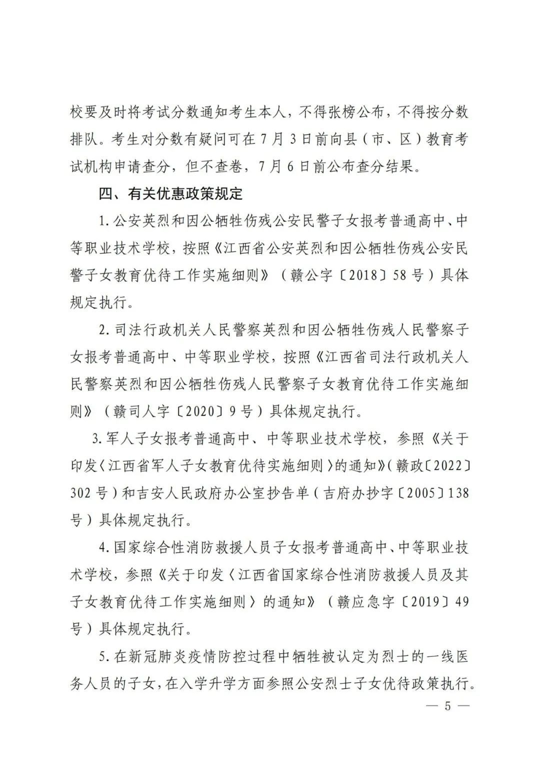 2.司法行政机关人民警察英烈和因公牺牲伤残人民警察子女报考普通高中、中等职业学校,按照《江西省司法行政机关人民警察英烈和因公牺牲伤残人民警察子女教育优待工作实施细则》(赣司人字〔2020〕9号)具体规定执行。