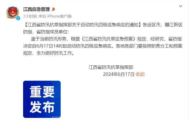 今天下午2点,江西省防汛抗旱指挥部启动了防汛四级应急响应,要求各地各部门要按照职责分工和预案规定,全力做好防汛工作。