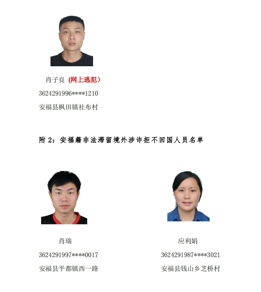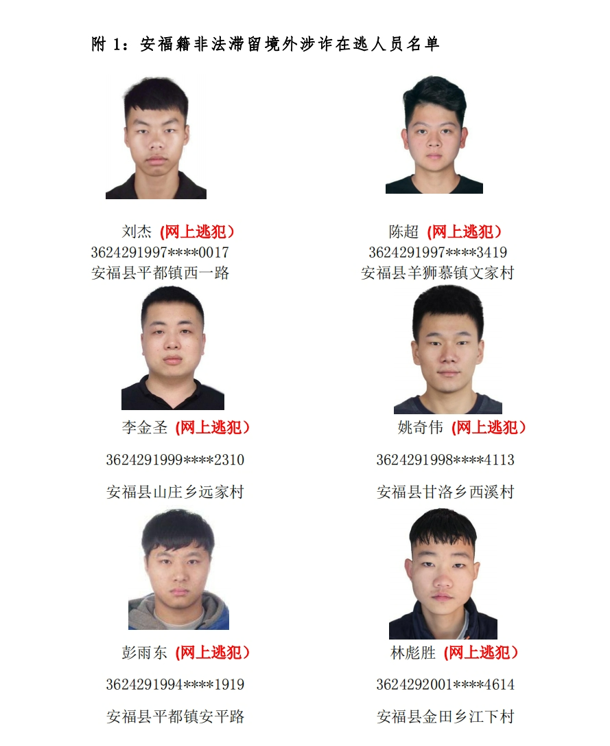 经查,安福籍非法滞留境外涉诈重点人员陈超、李金圣、姚奇伟、刘杰、林彪胜、肖子良、彭雨东涉嫌诈骗犯罪,公安机关已立案侦查,对 7 人采取刑事强制措施并上网追逃;对因非法出境入境、长期非法滞留境外拒不回国的谭彩彬、郑天洋、肖瑞、应利娟、李盼辉、刘小华、谢德仁 7 人予以公开悬赏。凡是在 2024 年 7 月 20 日前,提供线索成功抓获或是劝投的单位及个人给予奖励,并对提供线索人员的信息严格保密。