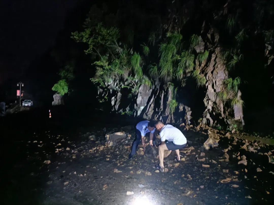 ▲6月22日晚21时许,修水县公安局竹坪派出所辖区杭口镇双井景区明月湾路段发生塌方,民警接警后第一时间联系杭口交警中队到达现场,设置路障,并在现场清理较大石块,提醒过往车辆绕行。