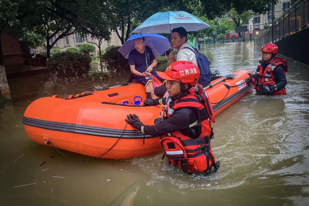 23日10时29分,九江市濂溪区馨苑山庄小区进出的路面已经完全被雨水淹没,积水最深处达到1.3米左右,部分居民家中也已进水,居民无法正常出行。消防救援人员立即使用浮艇泵连接水带进行排水,同时利用橡皮艇转移被困群众并帮助疏散物资。