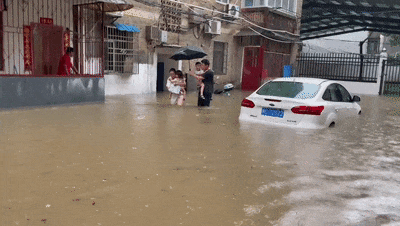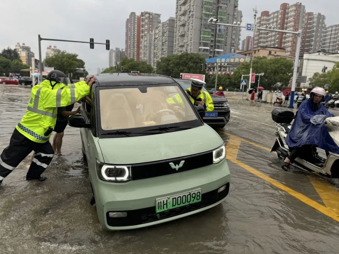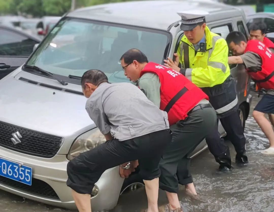 ▲九江市公安局交管支队第二大队三中队执勤民辅警巡逻至兴城大道春雨路路段,发现一辆涉水汽车熄火停滞,第一时间前往救助,抱出车内小孩并搀扶被困人员至安全路段。