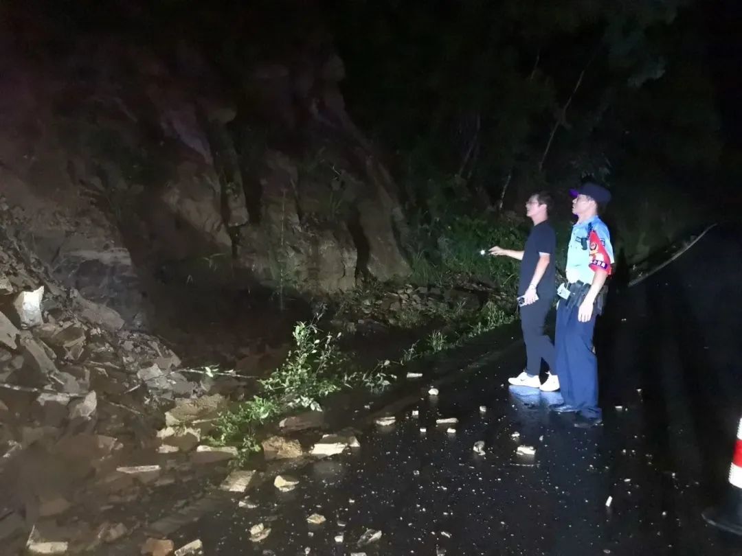 ▲6月22日晚21时许,修水县公安局竹坪派出所辖区杭口镇双井景区明月湾路段发生塌方,民警接警后第一时间联系杭口交警中队到达现场,设置路障,并在现场清理较大石块,提醒过往车辆绕行。