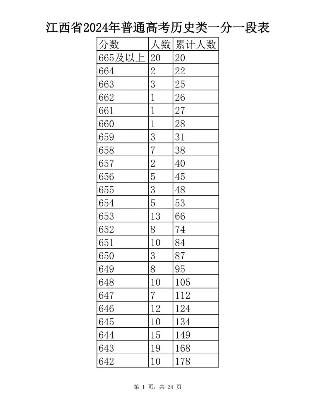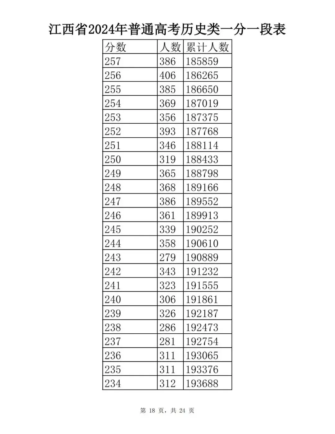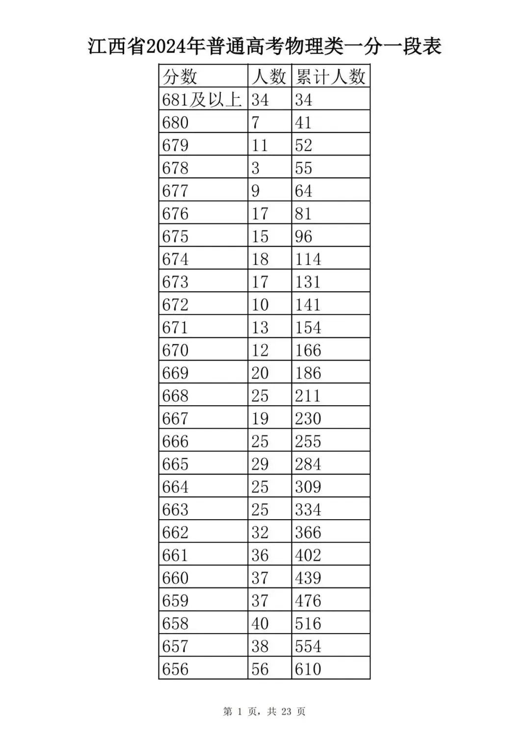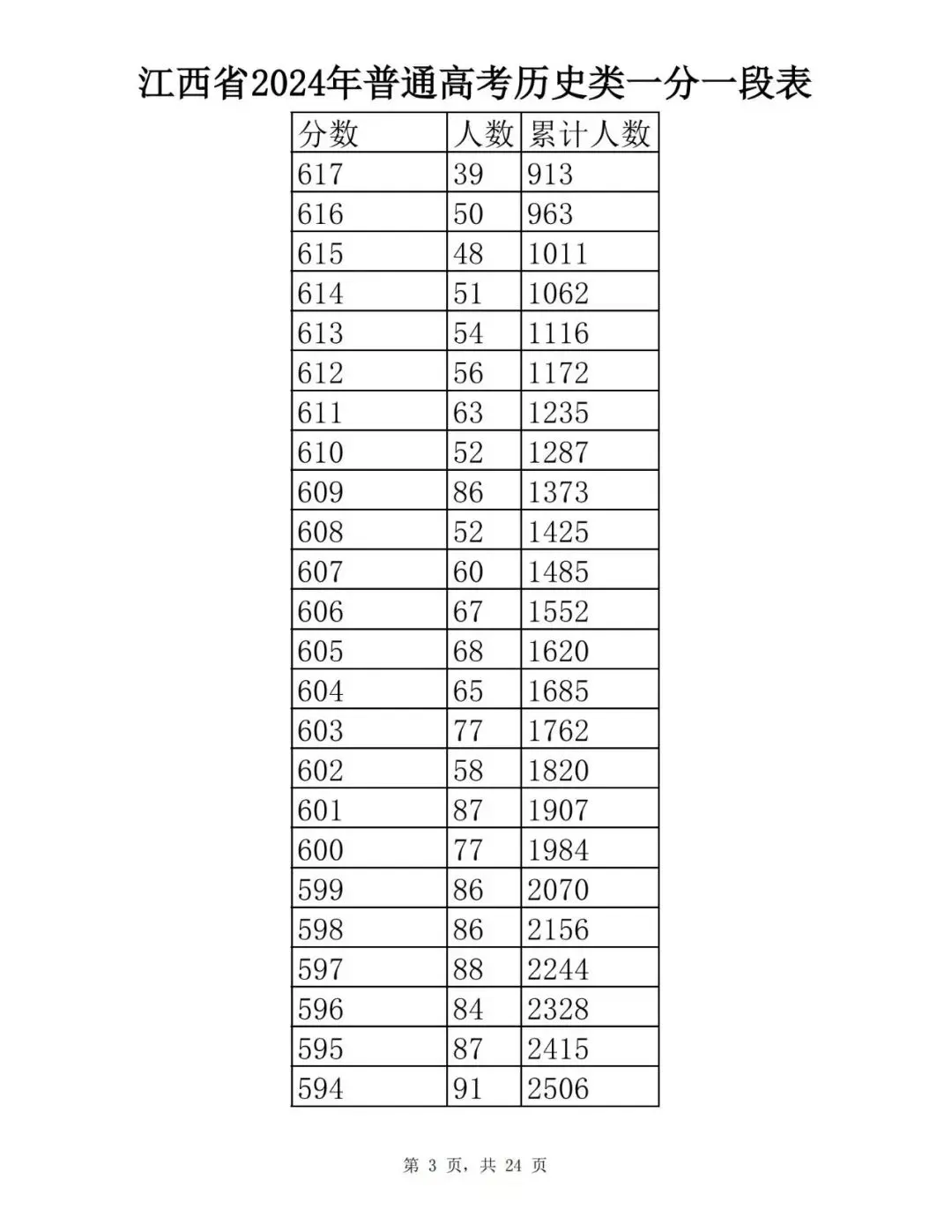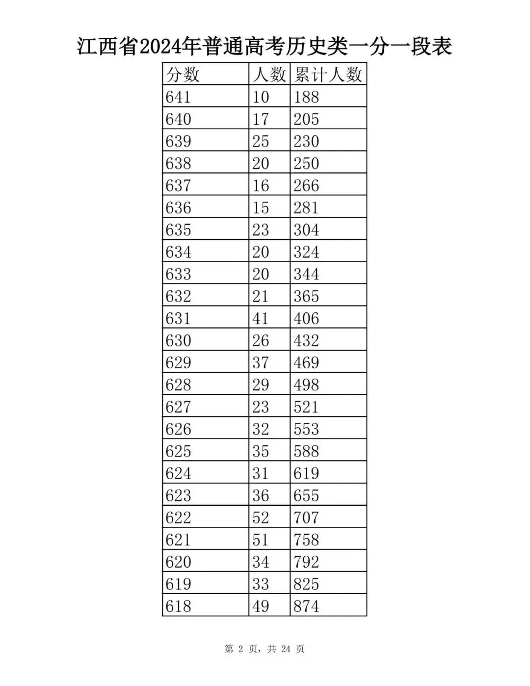 江西省2024普通高考一分一段表公布