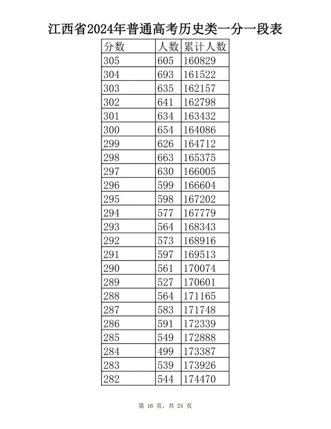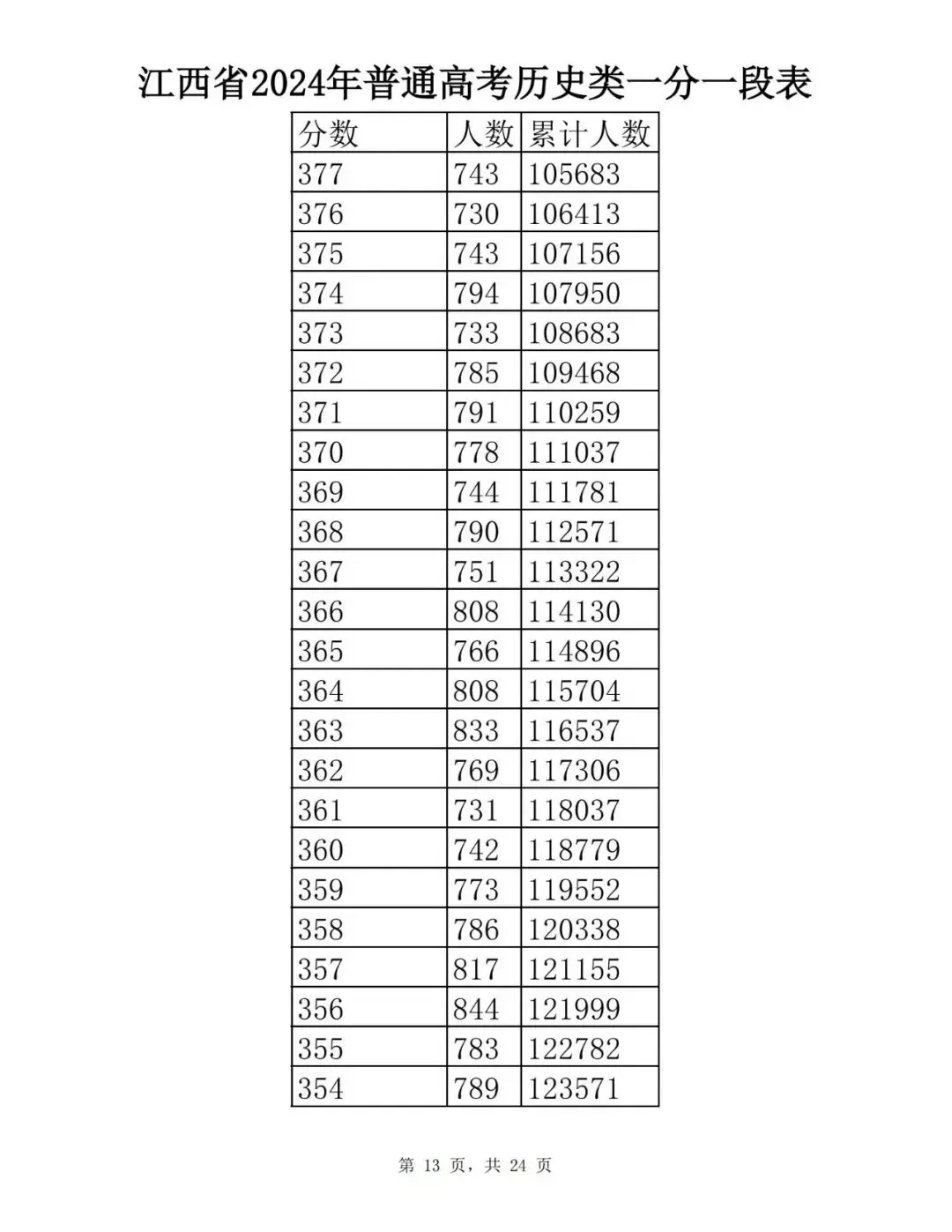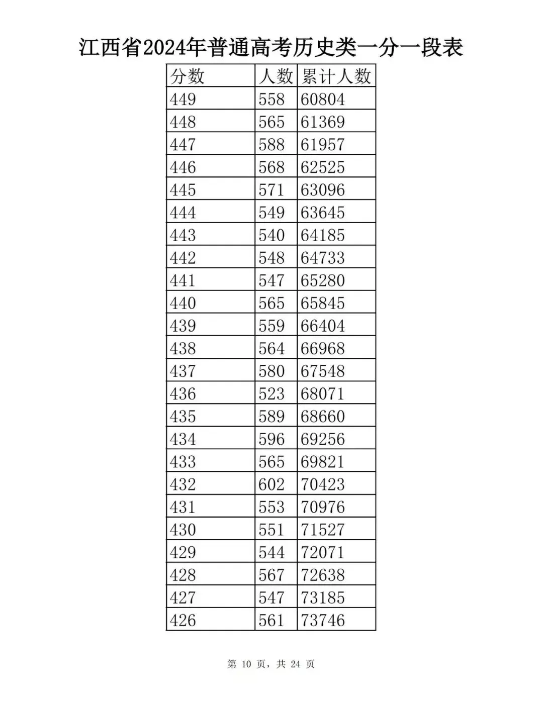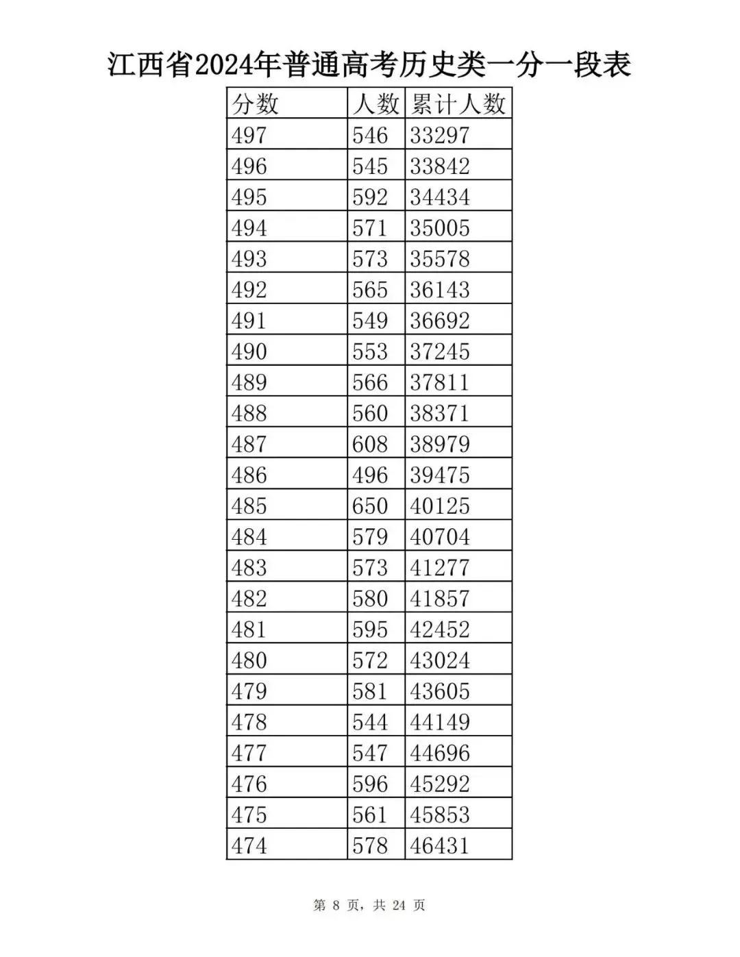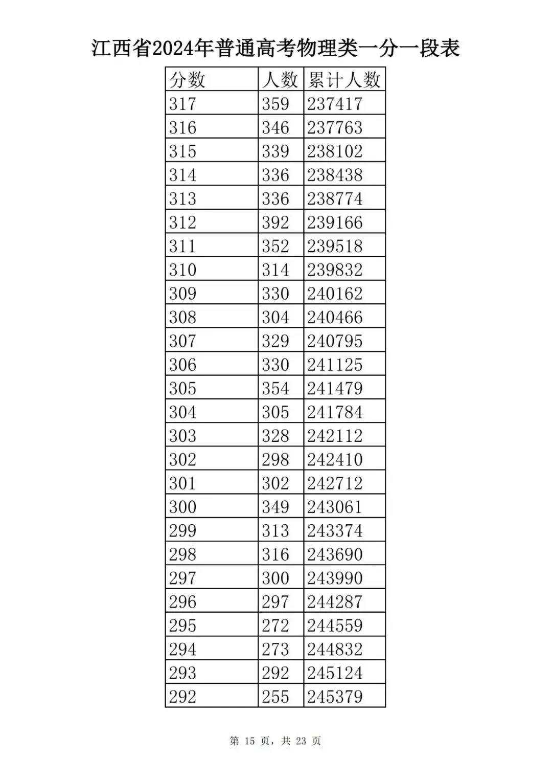江西省2024普通高考一分一段表公布