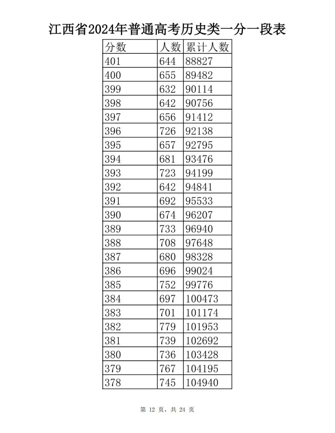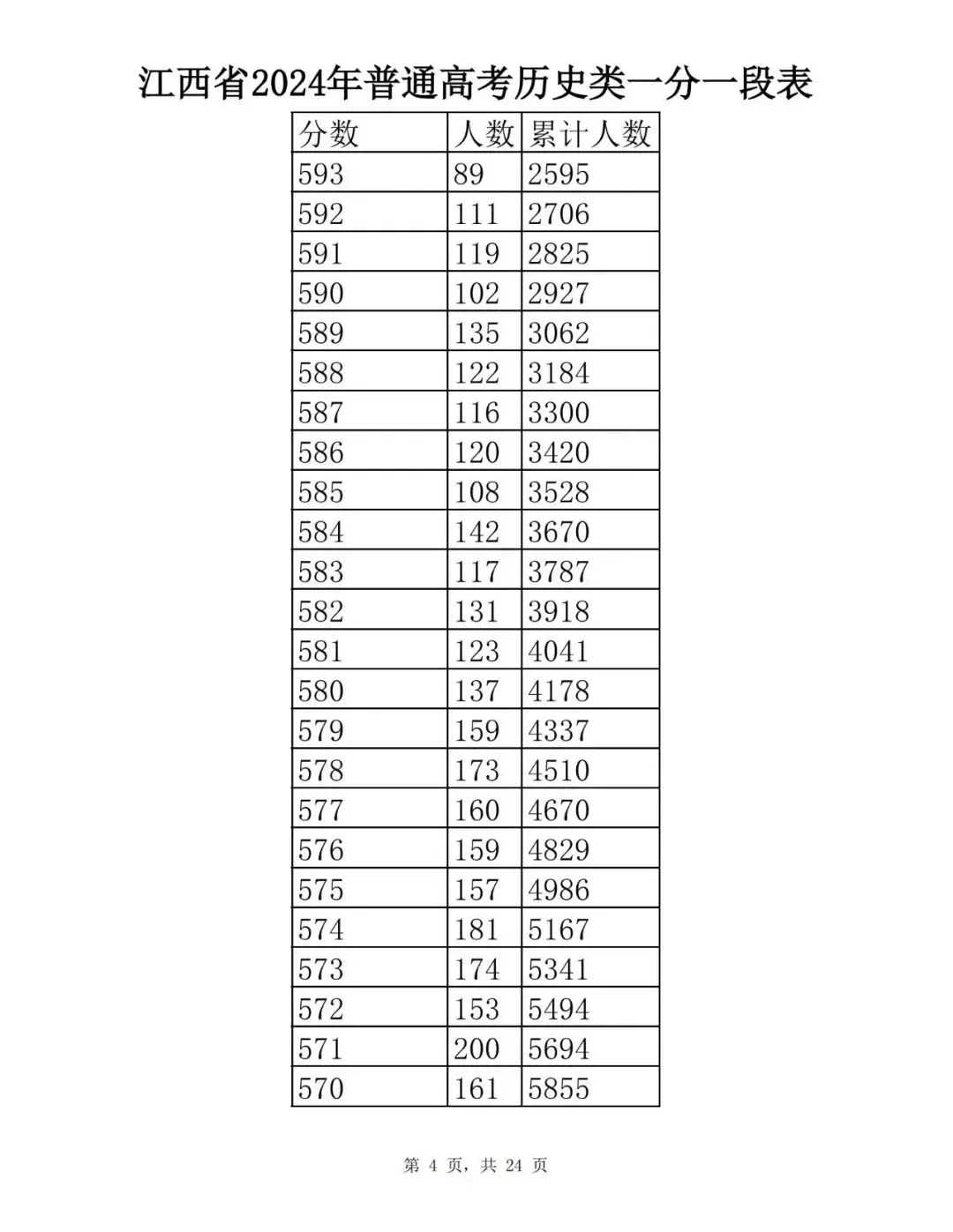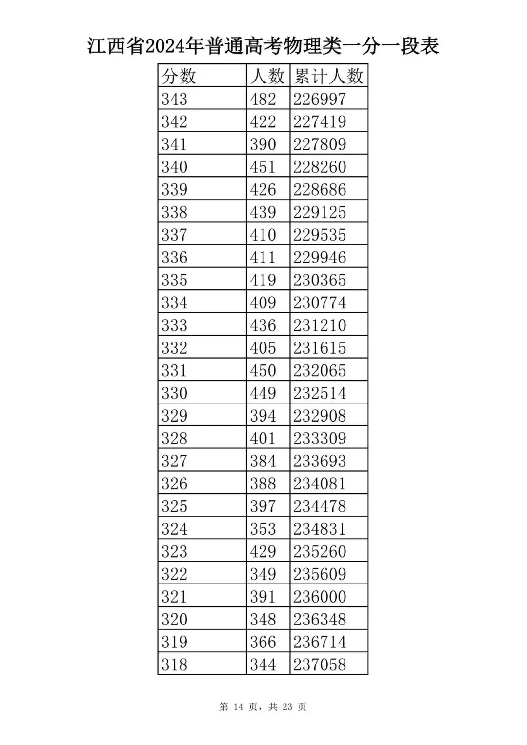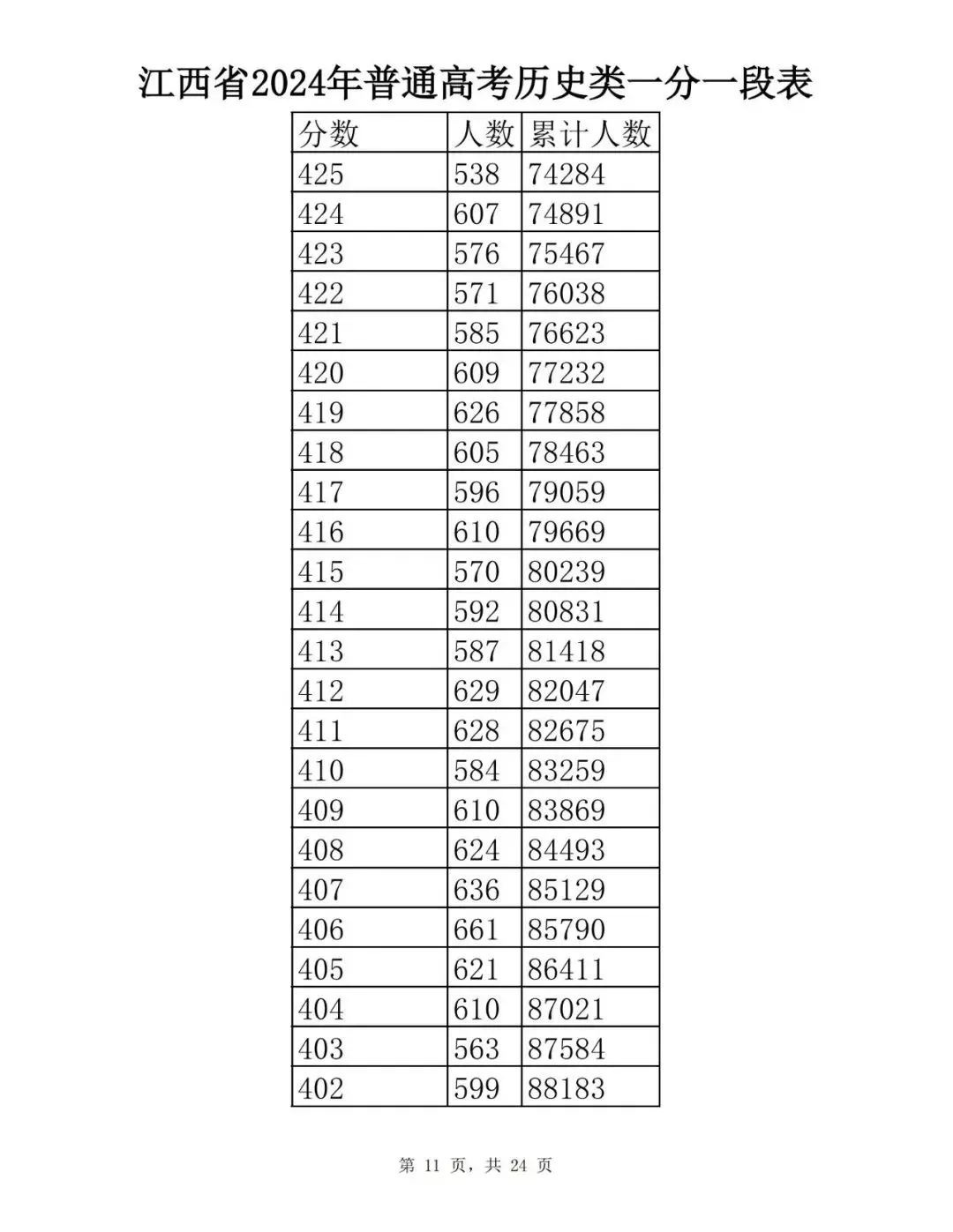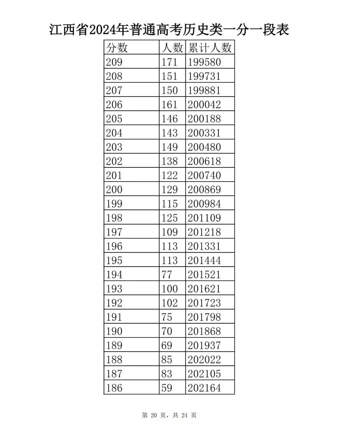 江西省2024普通高考一分一段表公布