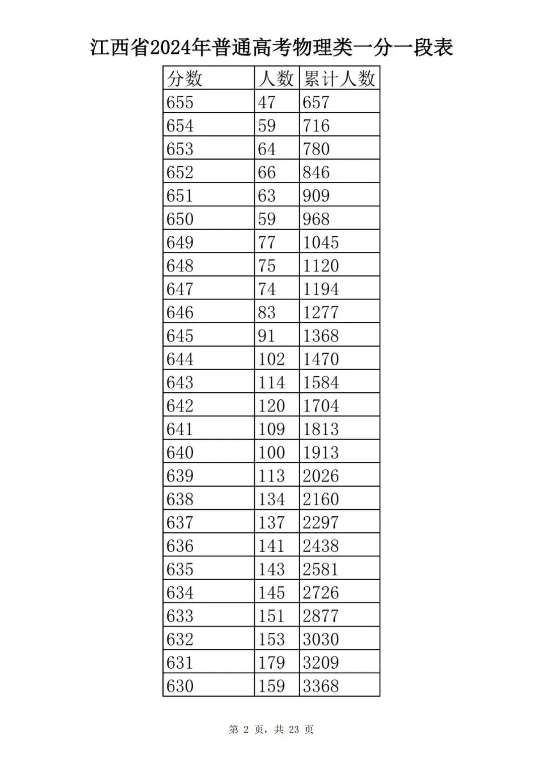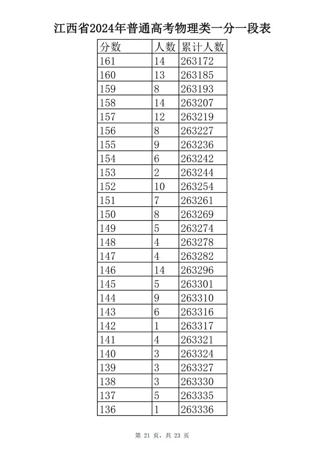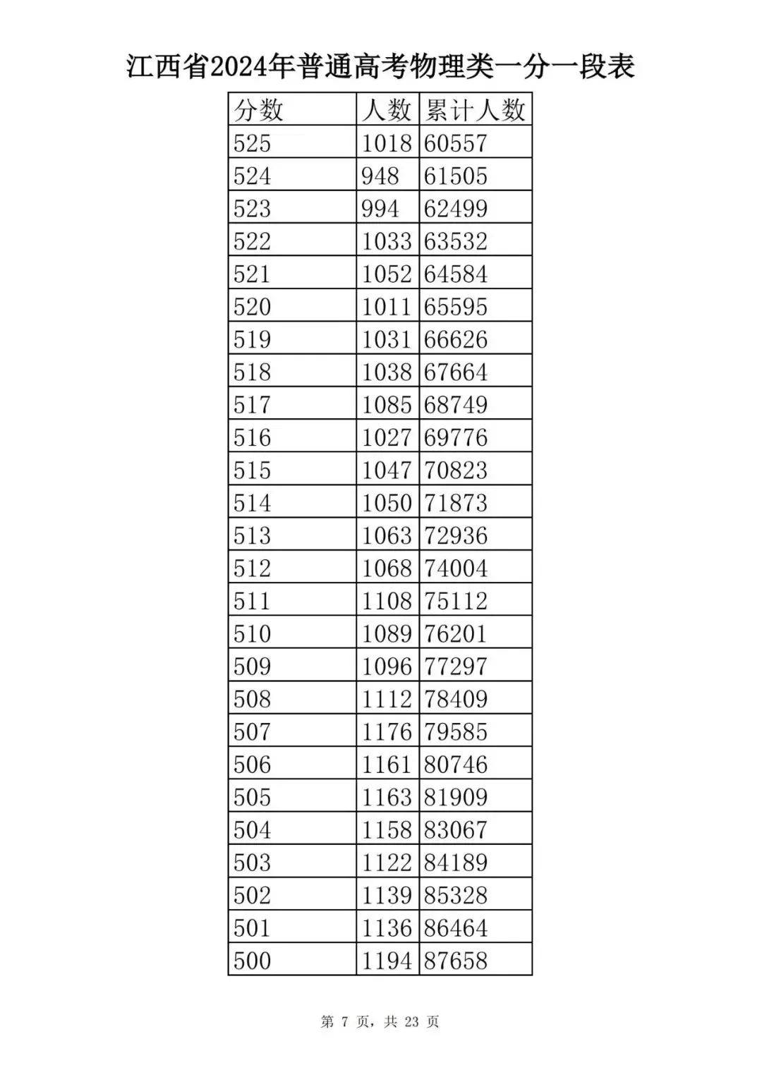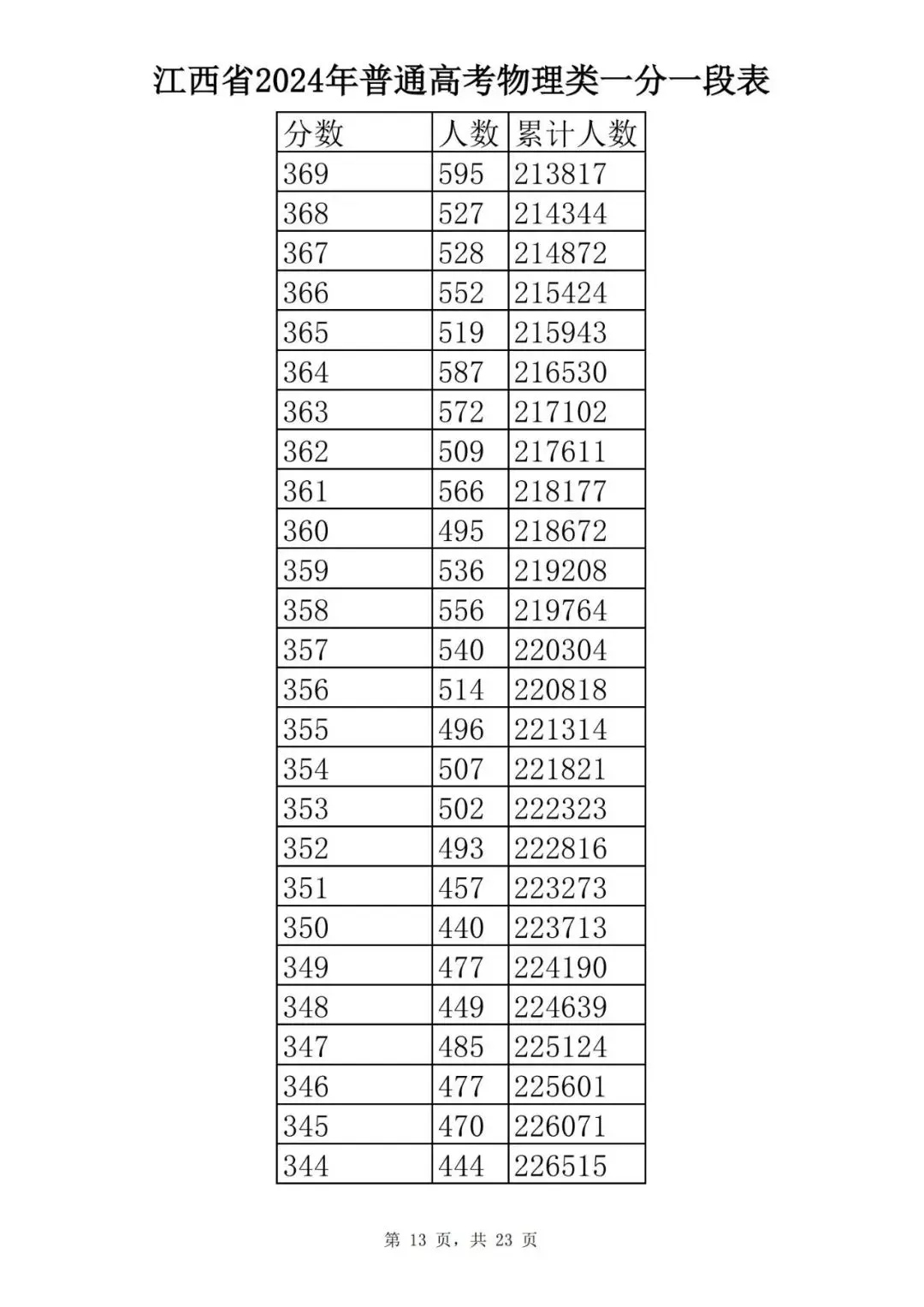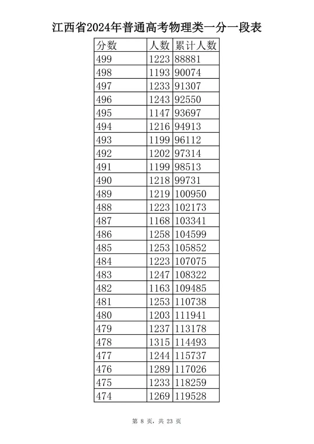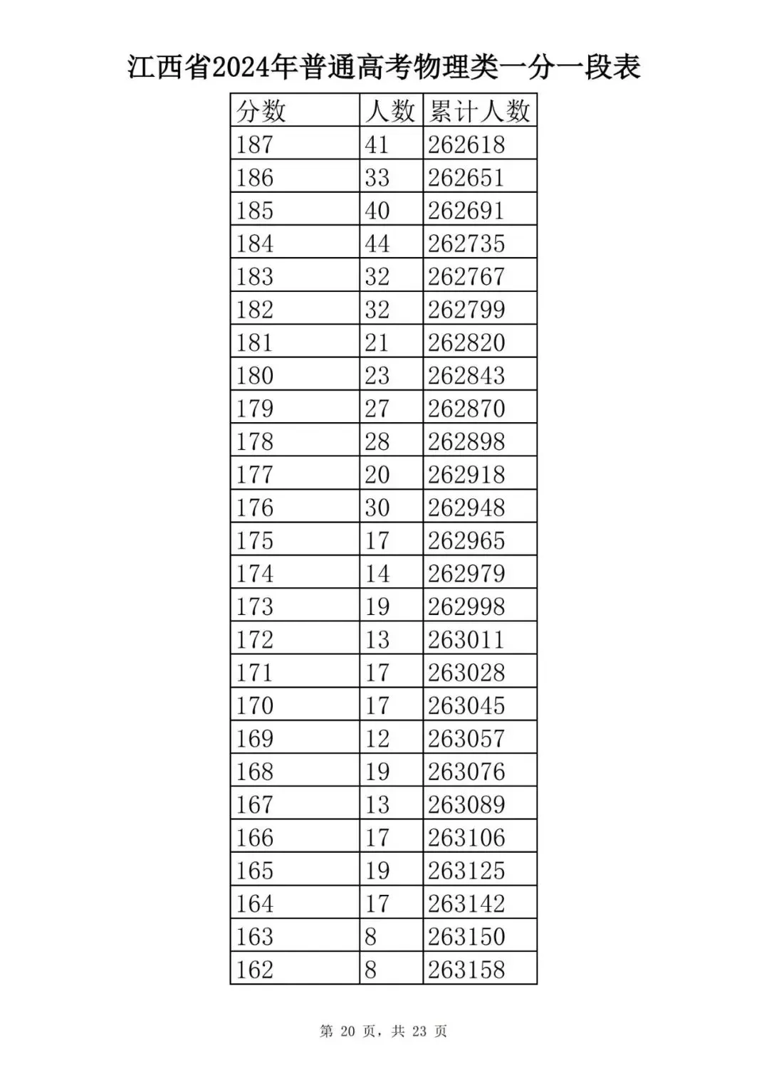 江西省2024普通高考一分一段表公布