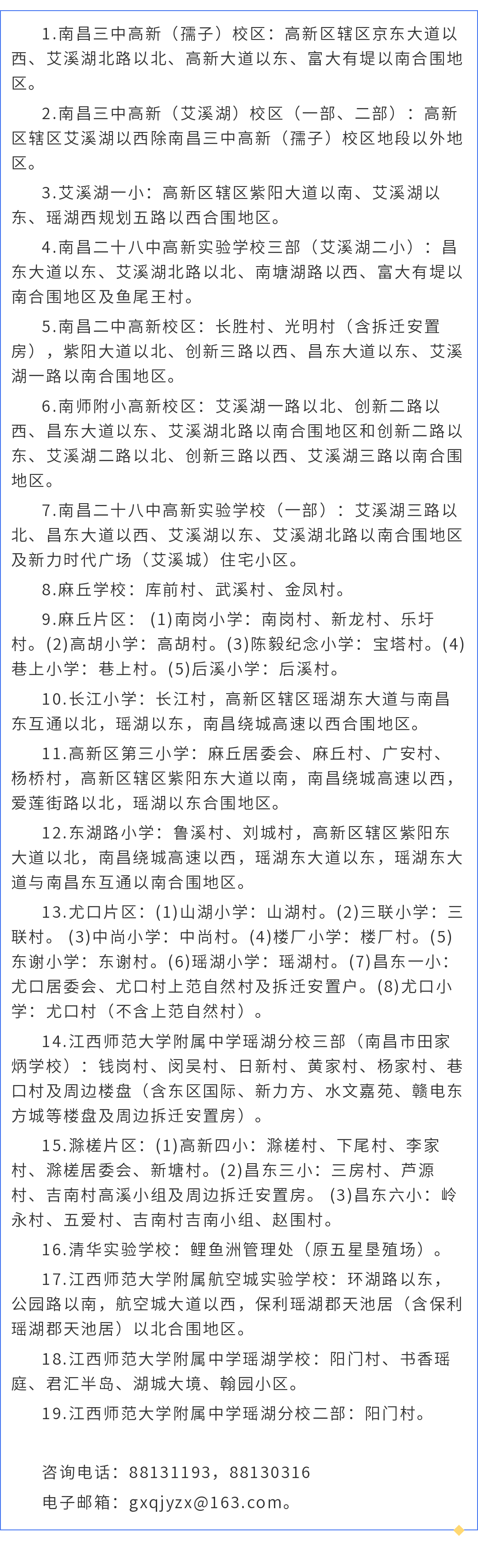 洪都北大道:双号2-1182号,单号311-1181号 化工原料厂 青山湖水产厂 江西电子仪器厂 省渔具厂联办单位职工子女及宿舍区 永溪村 汤家村 阳明东路(贤士二路段至洪都北大道路口) 铁道东路 福州路326号及以后 文教路 文教北路 文教支路 省图南路