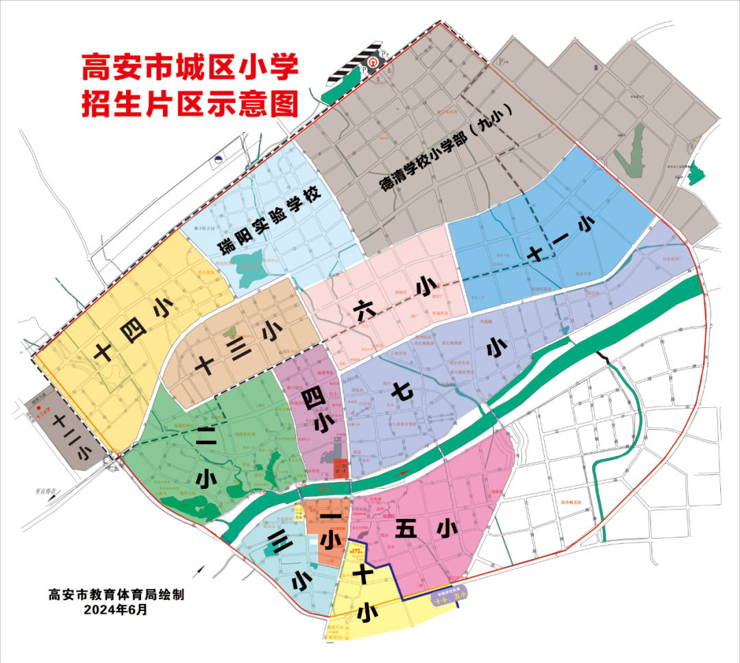 (13)高安十三小:锦惠中路以西、永安大道(原320国道)以南、瑞阳大道以北、上游路(原高伍公路)以东的所有单位和居民区。