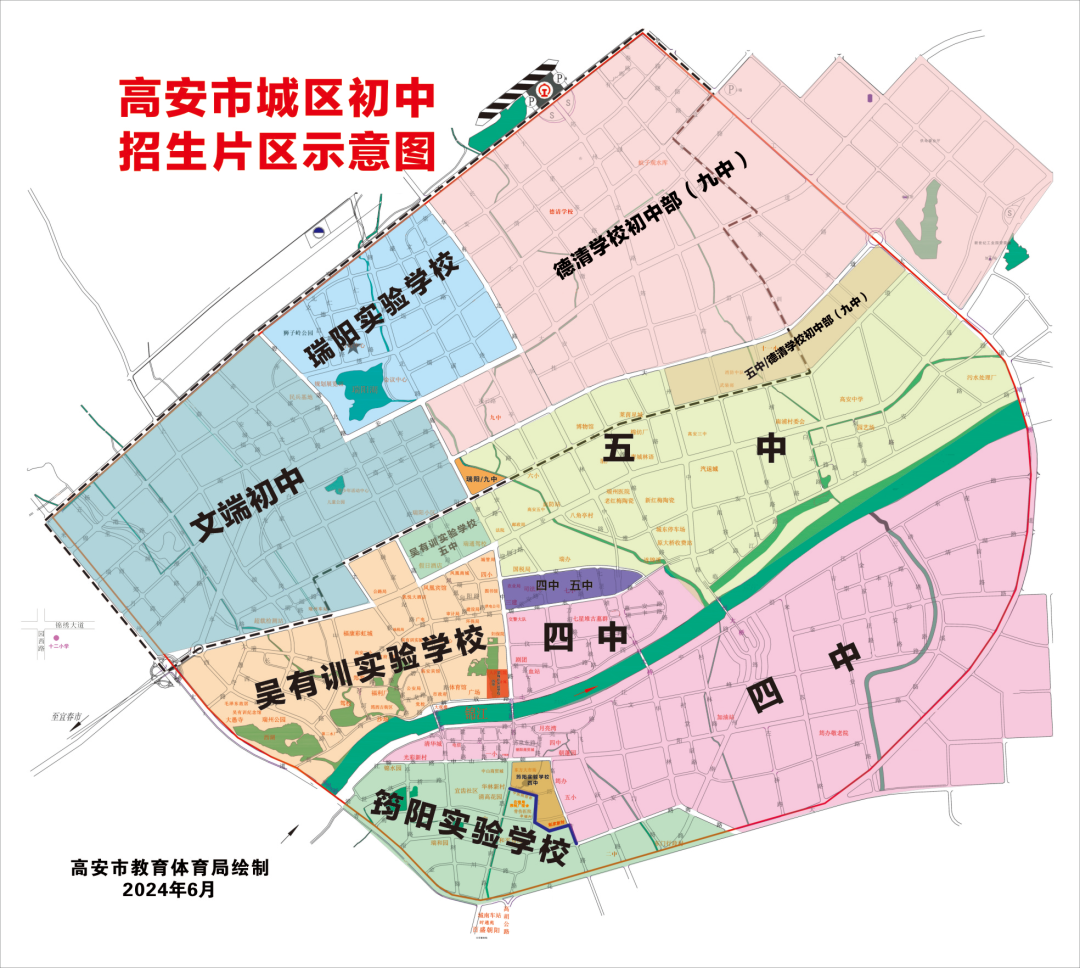碧落路(高安大道至瑞阳大道)以东、瑞阳大道以南、锦惠中路(原桥北路)以西,高安大道以北区域为吴有训实验学校和高安五中两校招生区域,区域内新生既可以选择在吴有训实验学校就读,也可以选择在高安五中就读。