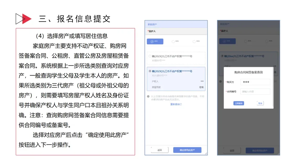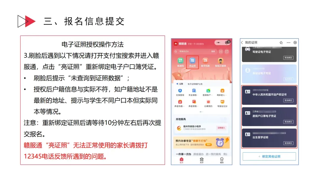 答:领取电子证照主要是便于后面报名时更加方便快捷,如您是江西省户籍则需要领取居民电子户口簿凭证,如非江西省户籍则无需操作。如您在本地区有房(不动产),为了便于后续报名操作建议领取不动产证照,无房的则无需操作。如您在“赣服通”亮证照里面没有查询到你报名所需要的房产,可以到报名时间进入系统进行报名,查询看是否有你报名所需房产,系统所对接的数据相对较全。如您的房产性质是公租房、直管公房无需通过亮证照去领取绑定。