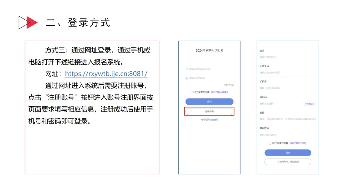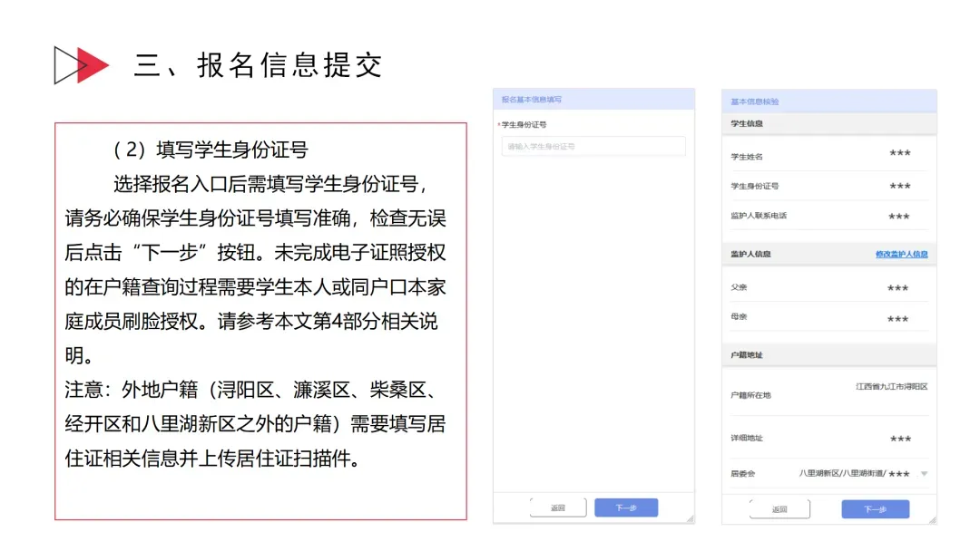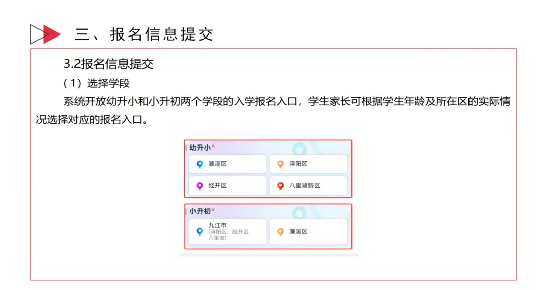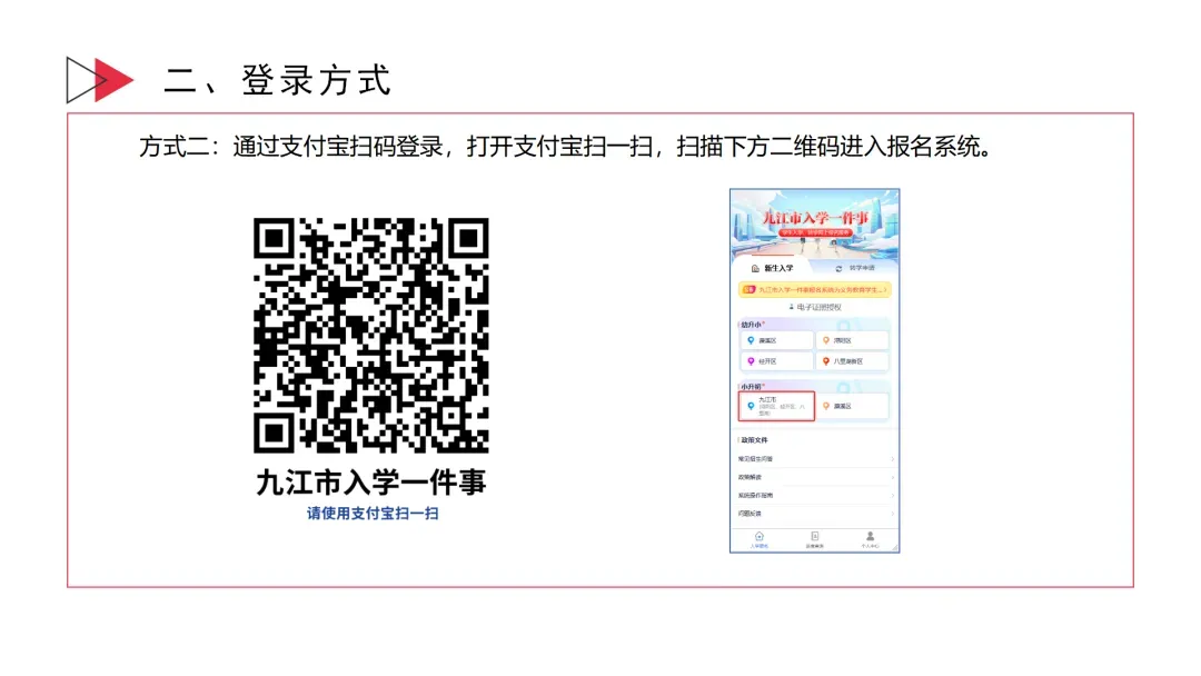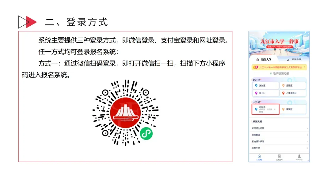 答:家长(需与学生在同一户口本上)可登录赣服通(可通过三种方式登录:微信登录、支付宝登录、网址登录),点击“城市服务”并更改“站点切换”为“九江市”,然后下滑并点击“入学一件事”,即可进行网上报名,通过填写小孩身份证号码,经过“电子证照授权”后,系统受理并自动核验小孩基本信息,7月份开始在系统中逐步完成“学校初审、联办单位审核、教育局审核”等程序,由教育局根据招生政策、学校学位情况、报名人数,综合考虑统筹录取,确定每个小孩子录取的学校,8月中下旬将及时通知家长。