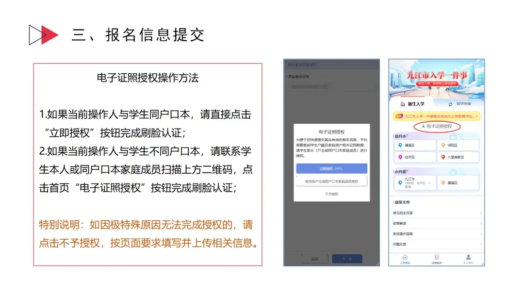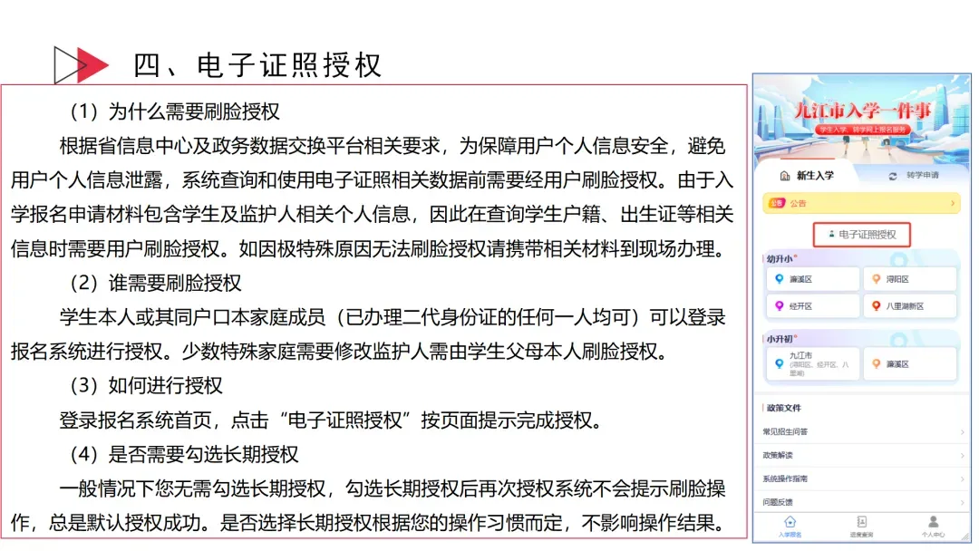 答:根据省信息中心及政务数据交换平台相关要求,为保障用户个人信息安全,避免用户个人信息泄露,系统查询和使用电子证照相关数据前需要经用户刷脸授权。由于入学报名申请材料包含学生及监护人相关个人信息。因此,在查询学生户籍、出生证等相关信息时需要用户刷脸授权。如因极特殊原因无法刷脸授权请携带相关材料到现场办理。
