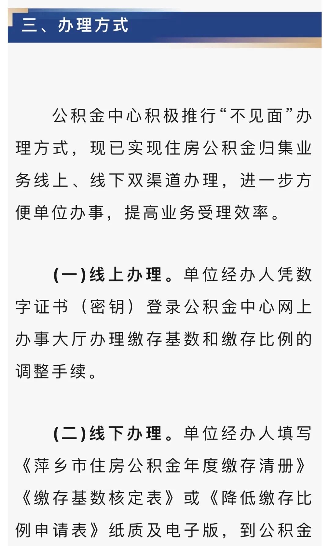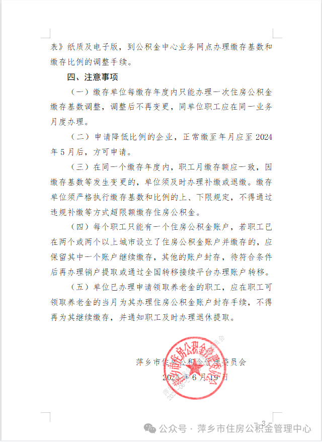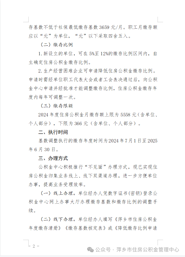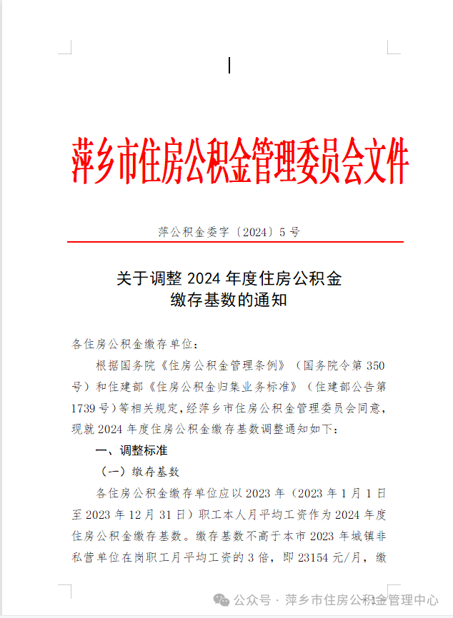 根据国务院《住房公积金管理条例》(国务院令第 350号)和住建部《住房公积金归集业务标准》(住建部公告第1739号)等相关规定,经萍乡市住房公积金管理委员会同意,现就 2024 年度住房公积金缴存基数调整通知如下: