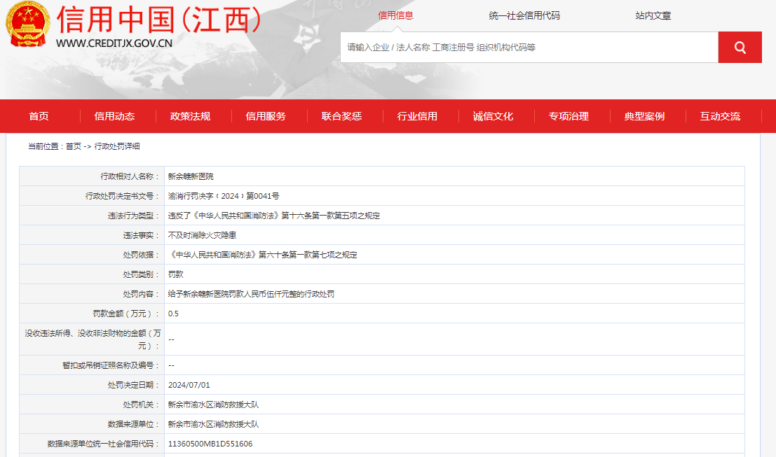 金融界消息,近日,新余赣新医院因不及时消除火灾隐患,被新余市渝水区消防救援大队给予罚款人民币5000元整的行政处罚。