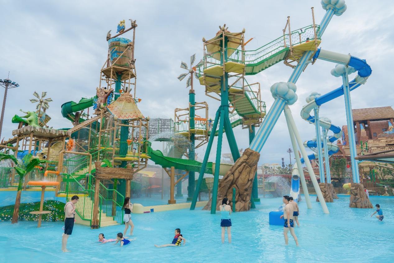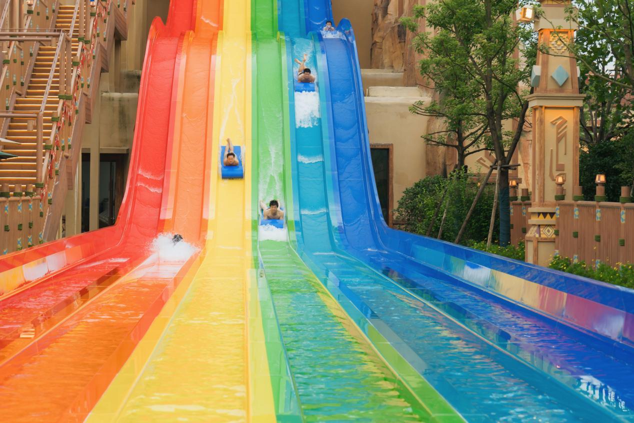 其中,《飓风湾》模拟大海的“真空造浪池”,拥有9种不同海浪的新奇体验,游客在水中尽情体验大海的汹涌与澎湃;《大喇叭》从近20米高的平台滑下,在巨大的喇叭口中盘旋、加速、冲刺,体验180度极速旋转带来的海上龙卷风之旅;《熊出没水寨》融合动漫元素,有造型各异的水滑道和丰富多彩的水上互动——翻斗桶、水滑梯、戏水玩具,都汇聚在这座欢乐的“魔幻水城”中,是亲子戏水必选项目。