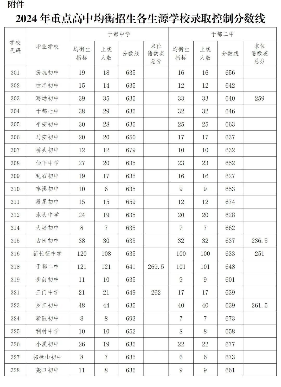 2.于都中学均衡录取最低控制分数线为635分(各生源学校录取控制分数线见附件),均衡调剂分数线为671分(末位语数英278.5分)。