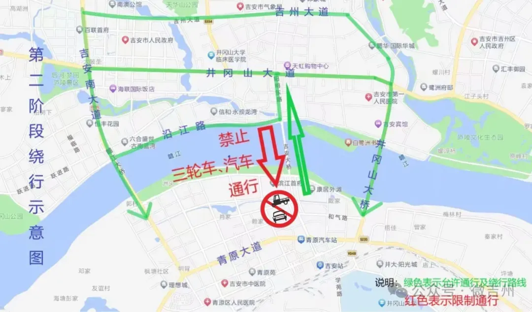 绕行路线二:通过井冈山大道或者吉州大道--大桥西路--井冈山大桥绕行。