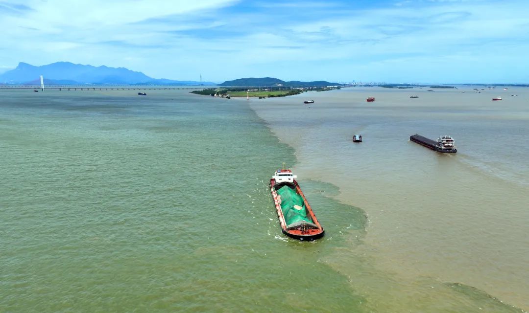 记者在鄱阳湖入长江之口看到,湖水流速平稳。由于长江来水含沙量大,与匀速流动的鄱阳湖之水交汇,绘制出了一幅壮观奇妙的“泾渭图”。从高空俯瞰,江水西来浑浊呈黄褐色,湖水南来清澈呈青绿色,两水交汇,清浊分明,形成一条延绵上千米的清浊分界线,堪称奇观。