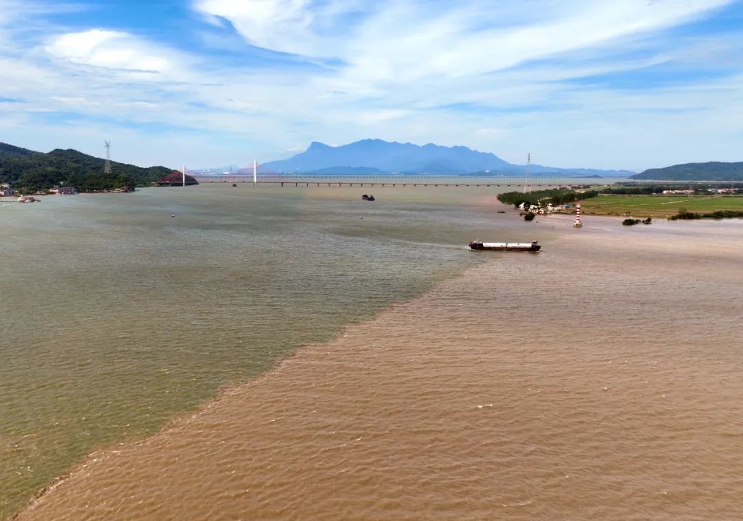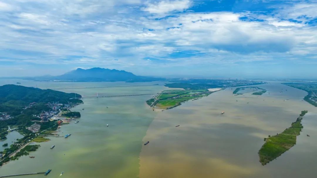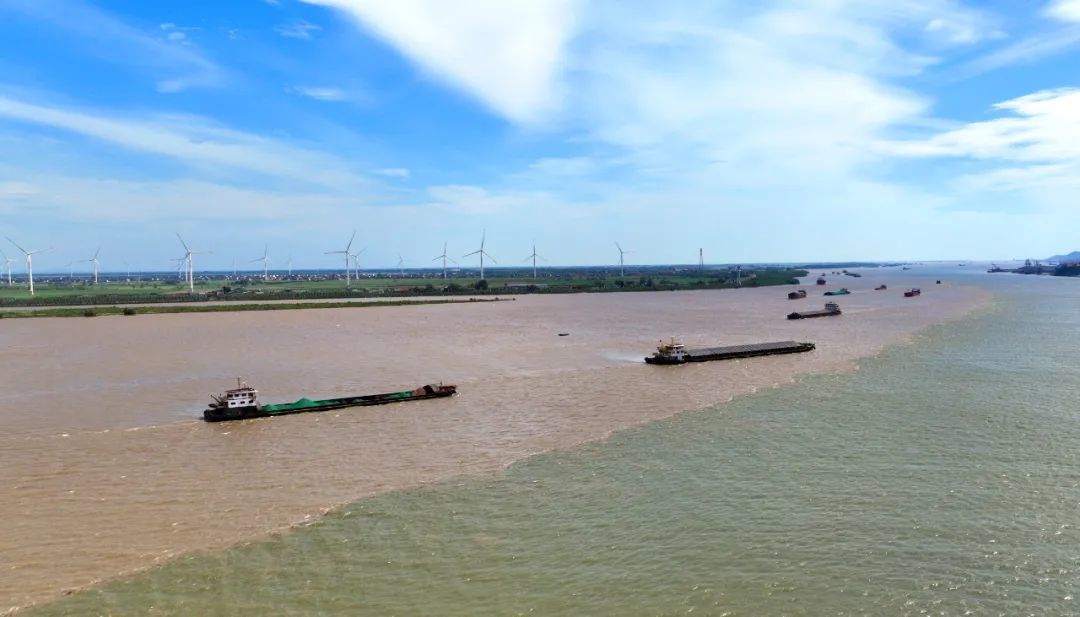 记者在鄱阳湖入长江之口看到,湖水流速平稳。由于长江来水含沙量大,与匀速流动的鄱阳湖之水交汇,绘制出了一幅壮观奇妙的“泾渭图”。从高空俯瞰,江水西来浑浊呈黄褐色,湖水南来清澈呈青绿色,两水交汇,清浊分明,形成一条延绵上千米的清浊分界线,堪称奇观。