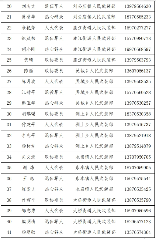 〔2017〕5号)文件规定,经相关单位推荐,樟树市人民政府征兵办公室审定,现将樟树市廉洁征兵监督员名单公示如下:若有人通过兵员征集谋取私利或违规操作,欢迎广大群众拨打监督员电话给予监督举报。