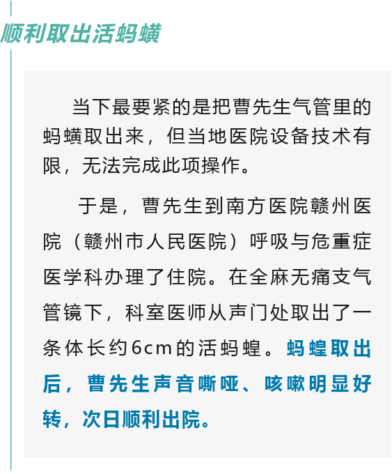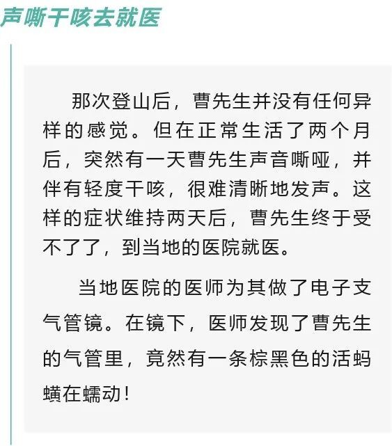 据南方医院赣州医院(赣州市人民医院)呼吸与危重症医学科副主任徐玉辉介绍,患者发病前曾在山间饮用过未经处理的山泉沟渠水,导致蚂蝗幼虫或虫卵进入体内,吸附在气管里,并靠着吸血逐渐长大。