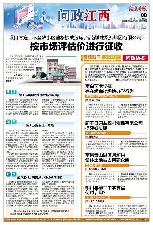 近日,有网友在大江网《问政江西》发帖反映,赣州市定南县金穗花园小区房屋因停车场项目施工导致出现开裂、破损等问题,给居住带来安全隐患。对此,定南城建投资集团有限公司回应称,已成立征收工作小组,将按市场评估价对房屋进行征收。