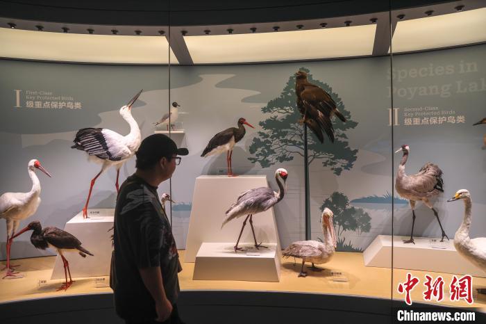8月6日,江西南昌,“湖泊·生命·呼唤——贝林捐赠动物标本暨鄱阳湖自然生态展”在江西省博物馆开展,370余件来自世界各大洲不同湖泊区域的珍稀野生动植物标本被集中展出,其中包括美国环球健康与教育基金会捐赠的270余件自然标本中的部分标本。该展览展现了环球多种地理环境,凸显鄱阳湖流域生态系统多样性及其特征与代表性物种。该展览为江西首个贝林捐赠动物标本展,也是江西目前规模最大的自然主题展。图为展出的鄱阳湖珍惜候鸟标本吸引观众观看。中新社记者 刘力鑫 摄