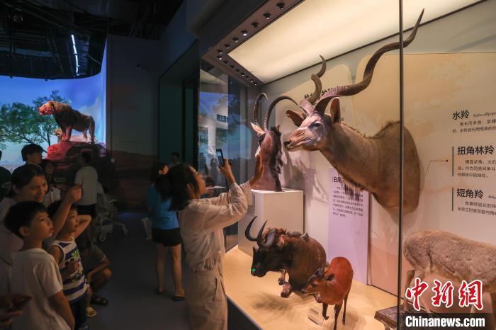 8月6日,江西南昌,“湖泊·生命·呼唤——贝林捐赠动物标本暨鄱阳湖自然生态展”在江西省博物馆开展,370余件来自世界各大洲不同湖泊区域的珍稀野生动植物标本被集中展出,其中包括美国环球健康与教育基金会捐赠的270余件自然标本中的部分标本。该展览展现了环球多种地理环境,凸显鄱阳湖流域生态系统多样性及其特征与代表性物种。该展览为江西首个贝林捐赠动物标本展,也是江西目前规模最大的自然主题展。图为展出的非洲地区的动物标本吸引观众观看。中新社记者 刘力鑫 摄