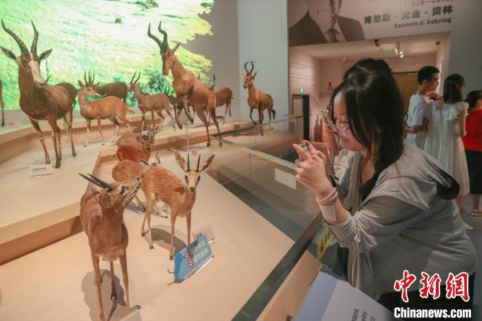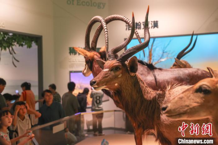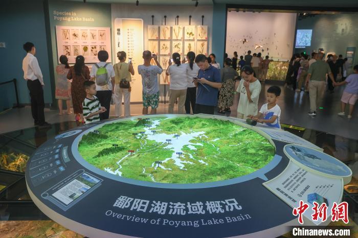 8月6日,江西南昌,“湖泊·生命·呼唤——贝林捐赠动物标本暨鄱阳湖自然生态展”在江西省博物馆开展,370余件来自世界各大洲不同湖泊区域的珍稀野生动植物标本被集中展出,其中包括美国环球健康与教育基金会捐赠的270余件自然标本中的部分标本。该展览展现了环球多种地理环境,凸显鄱阳湖流域生态系统多样性及其特征与代表性物种。该展览为江西首个贝林捐赠动物标本展,也是江西目前规模最大的自然主题展。图为不少观众在参观展览。中新社记者 刘力鑫 摄