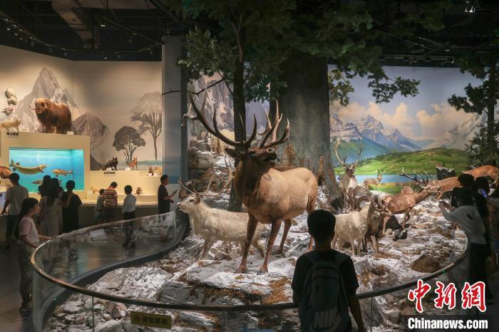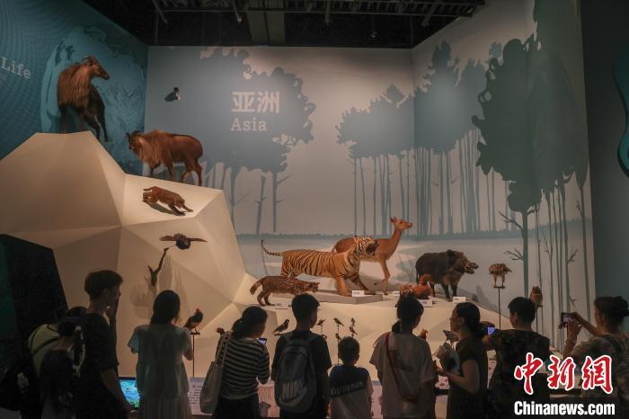 8月6日,江西南昌,“湖泊·生命·呼唤——贝林捐赠动物标本暨鄱阳湖自然生态展”在江西省博物馆开展,370余件来自世界各大洲不同湖泊区域的珍稀野生动植物标本被集中展出,其中包括美国环球健康与教育基金会捐赠的270余件自然标本中的部分标本。该展览展现了环球多种地理环境,凸显鄱阳湖流域生态系统多样性及其特征与代表性物种。该展览为江西首个贝林捐赠动物标本展,也是江西目前规模最大的自然主题展。图为展出的亚洲地区的各类动物标本吸引观众观看。中新社记者 刘力鑫 摄