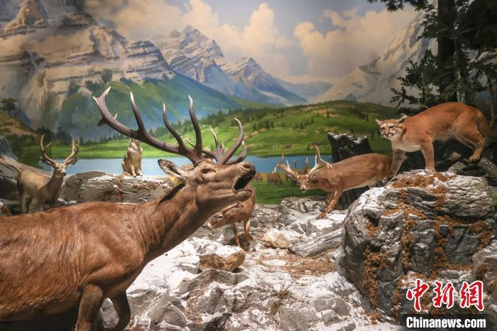 8月6日,江西南昌,“湖泊·生命·呼唤——贝林捐赠动物标本暨鄱阳湖自然生态展”在江西省博物馆开展,370余件来自世界各大洲不同湖泊区域的珍稀野生动植物标本被集中展出,其中包括美国环球健康与教育基金会捐赠的270余件自然标本中的部分标本。该展览展现了环球多种地理环境,凸显鄱阳湖流域生态系统多样性及其特征与代表性物种。该展览为江西首个贝林捐赠动物标本展,也是江西目前规模最大的自然主题展。图为展出的北美洲地区的各类动物标本栩栩如生。中新社记者 刘力鑫 摄
