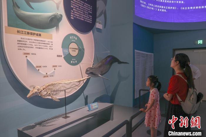 8月6日,江西南昌,“湖泊·生命·呼唤——贝林捐赠动物标本暨鄱阳湖自然生态展”在江西省博物馆开展,370余件来自世界各大洲不同湖泊区域的珍稀野生动植物标本被集中展出,其中包括美国环球健康与教育基金会捐赠的270余件自然标本中的部分标本。该展览展现了环球多种地理环境,凸显鄱阳湖流域生态系统多样性及其特征与代表性物种。该展览为江西首个贝林捐赠动物标本展,也是江西目前规模最大的自然主题展。图为展出的长江江豚标本吸引观众观看。中新社记者 刘力鑫 摄