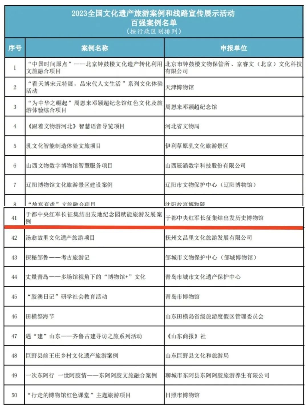 江西新闻客户端讯(江西日报全媒体记者曾悦之 实习生杨雅雯)近日,由中国文物报社、中华文明研学旅游联盟主办的2023全国文化遗产旅游案例和线路宣传展示活动“百强案例”“五十强线路”发布,由于都中央红军长征集结出发历史博物馆申报的案例“于都中央红军长征集结出发地纪念园赋能旅游发展案例”跻身全国百强。