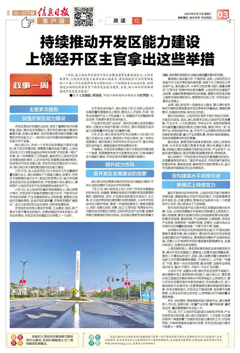 可以说,为了上饶经开区能适应当前经济形势、产业形势的变化和发展,胡心田从项目招引、人才培养、队伍建设等多个角度部署了加强开发区能力建设的工作。对当地而言,只有持续推进全面深化改革,开发区综合能力建设才能更上一层楼。