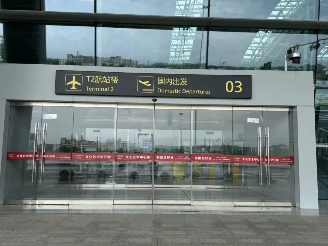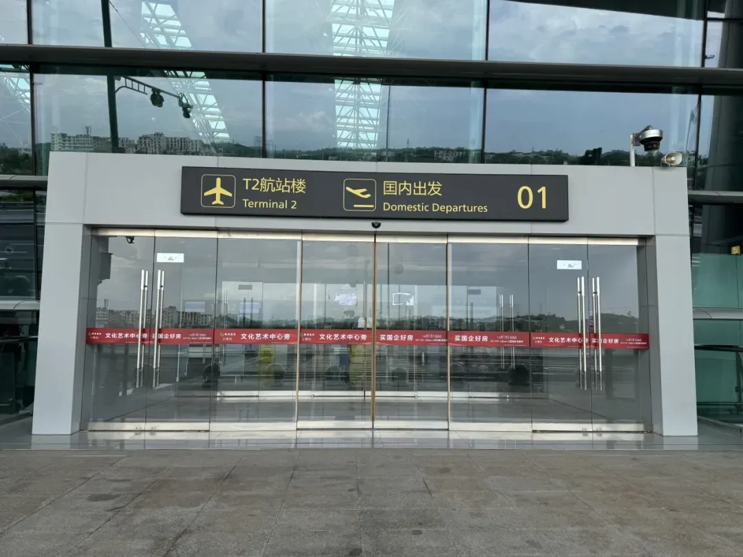 此门只出不进,为自动感应门,人员由此外出航站楼。