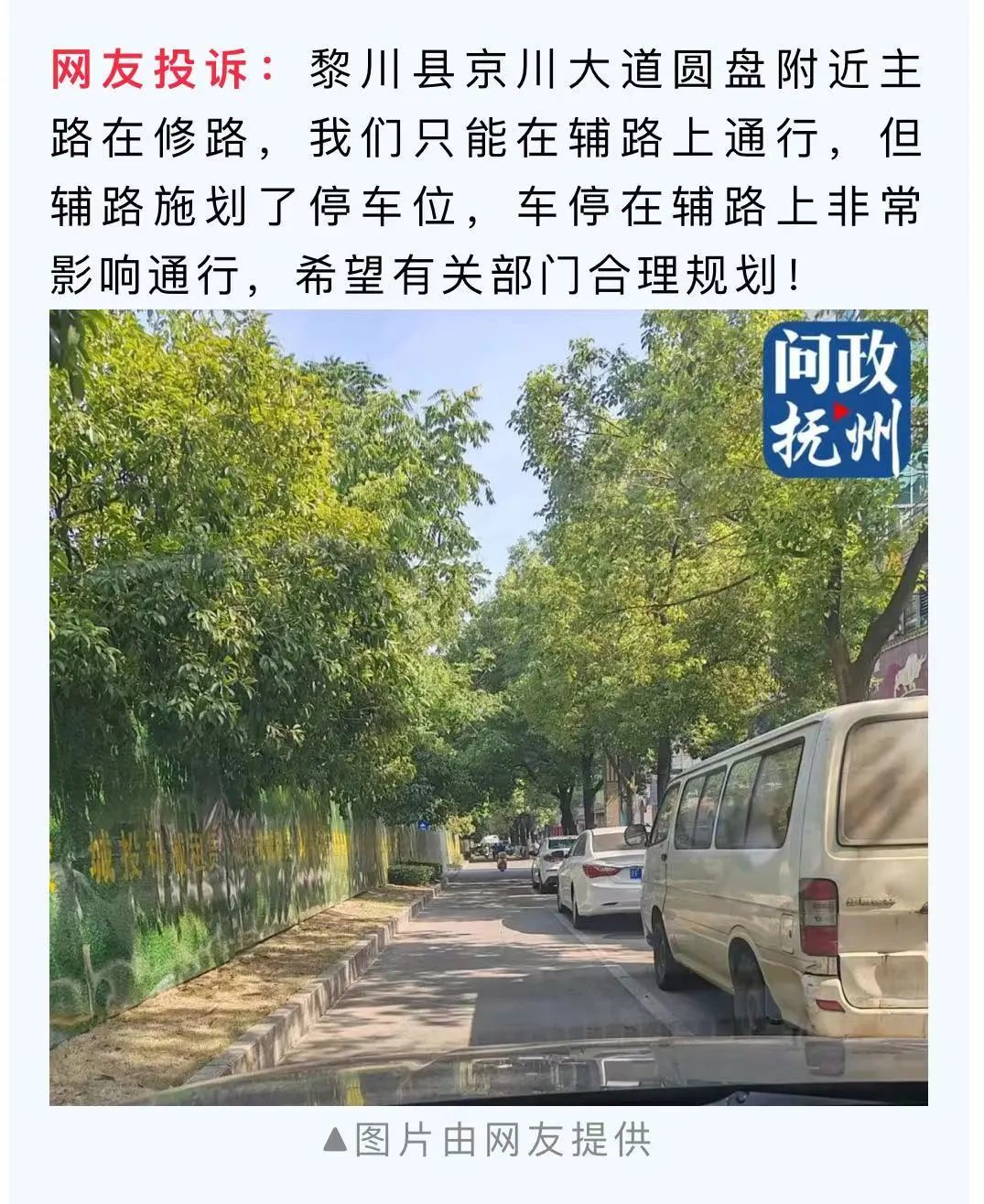 黎川县京川大道圆盘附近主路在修路,我们只能在辅路上通行,但辅路施划了停车位,车停在辅路上非常影响通行,希望有关部门合理规划!