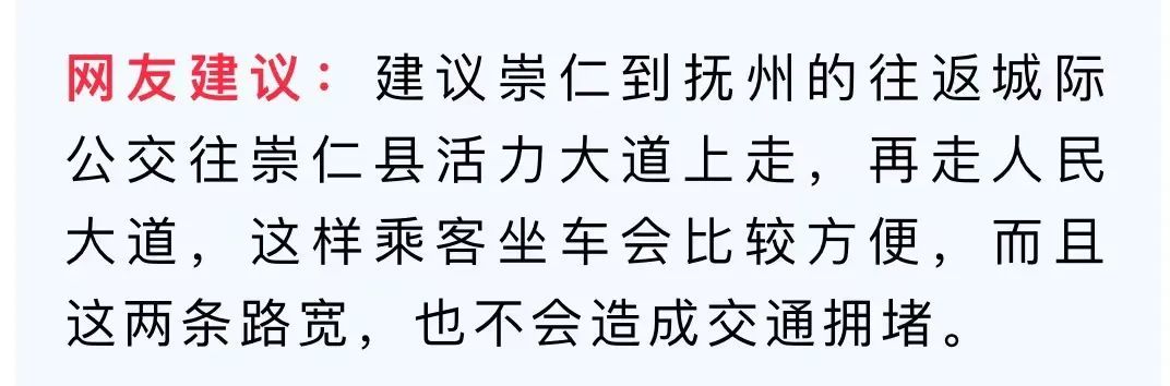 建议崇仁到抚州的往返城际公交往崇仁县活力大道上走,再走人民大道,这样就非常方便我们坐车,而且这两条路宽,也不会造成交通拥堵。