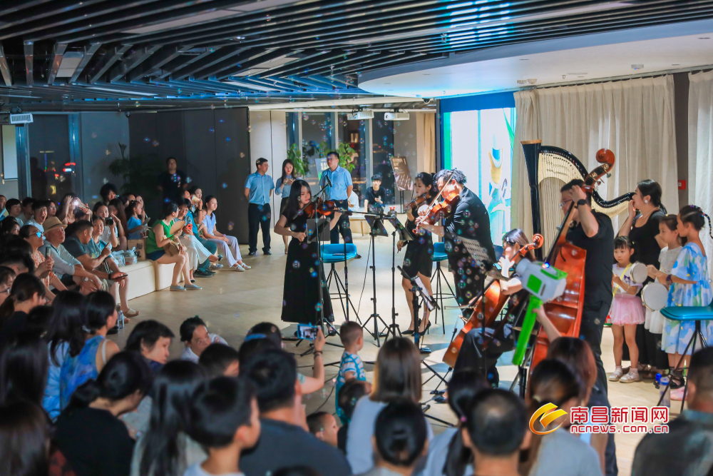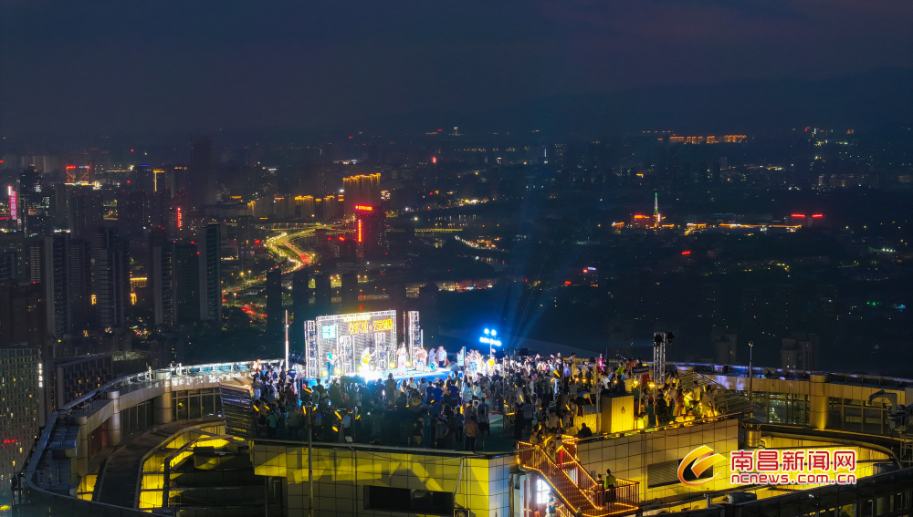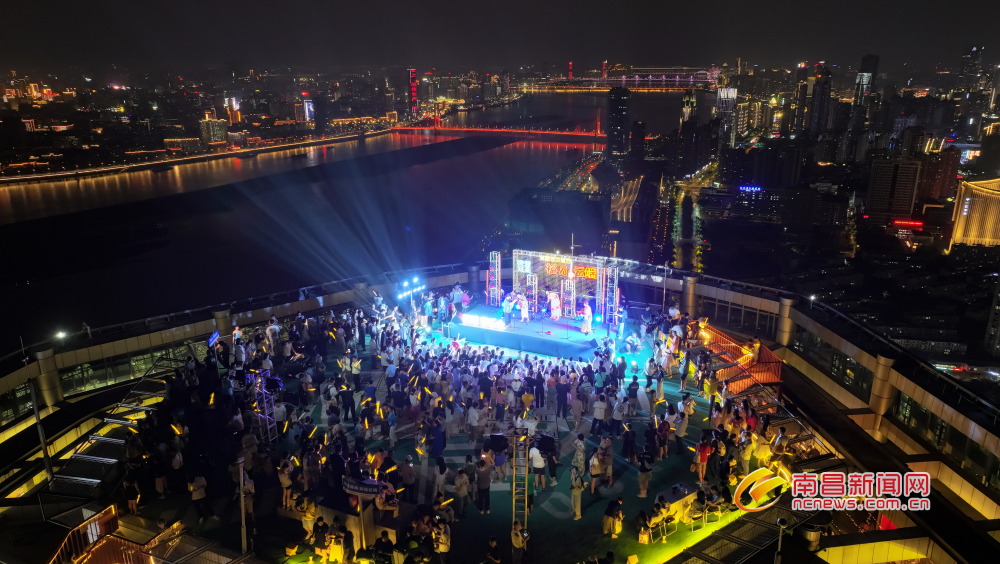 8月23日晚,江景璀璨,秋夜迷人。在红谷滩区凤凰洲江西裕民银行顶楼,一场“云端盛会”热闹举行。市民游客逛复古集市,听精彩演唱,感受南昌夜生活的魅力。