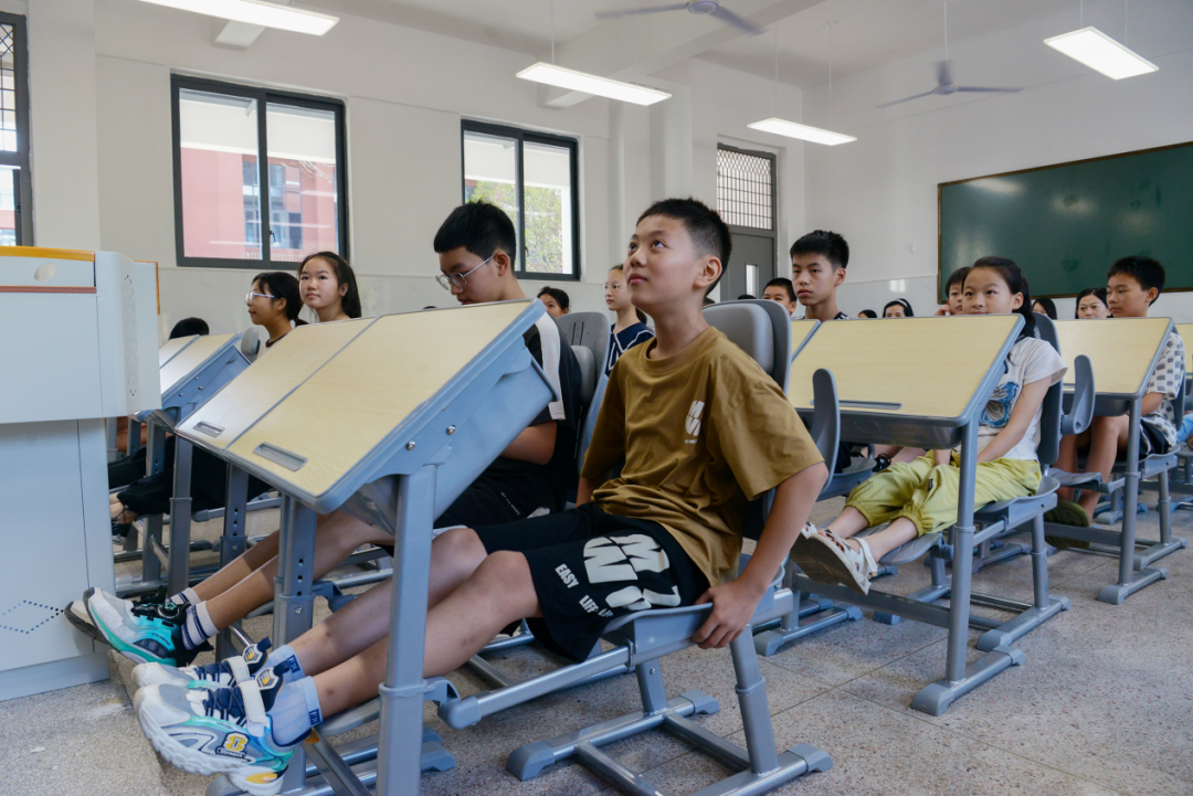 “很新奇! 我一进教室就看到全新的课桌椅,发现和以前使用的课桌椅不一样, 新的座椅有靠背、靠枕和扶手,课桌也能调节高度。 ”七年级新生杜书萱开心地说,“‘可躺式’课桌椅操作简单,我在1分钟左右就能调节好,躺着非常舒服! ”